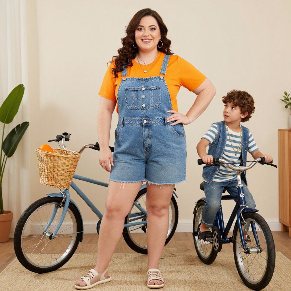 Grease plus size woman rizzo, solo, brown hair, jewelry, shirt, 1girl, hand on own hip, overalls, shoes, orange shirt, indoors, standing, 1boy, bicycle, necklace