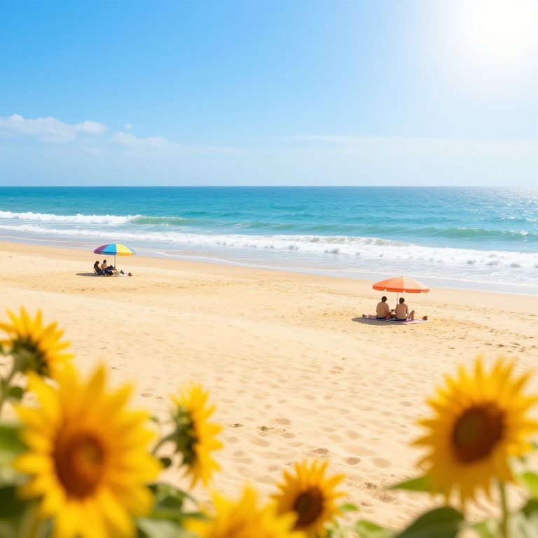 Summer: A serene beach scene with golden sand and turquoise waves under a bright blue sky, vibrant sunflowers in the foreground, warm sunlight casting soft shadows, people enjoying a picnic with colorful umbrellas and a gentle sea breeze, in a photorealistic style.