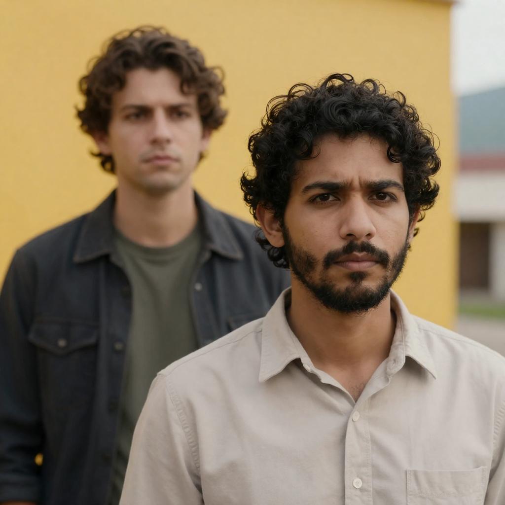 Photograph of four teenagers riding a blue motor scooter on a sandy beach. The boy in the front wears a green shirt, the second boy in a yellow shirt, the girl in the back wears a pink checkered top, and the fourth girl has curly hair. They are close together, focused forward. The background includes blurred beach elements and a white structure. Intense expressions on the faces. Sunlight highlights their skin and hair.