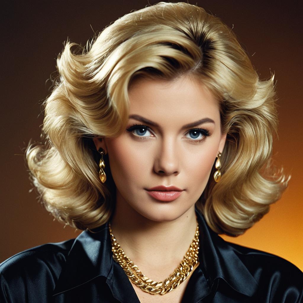 Photorealistic digital portrait of a blonde woman with voluminous waves styled in a 1980s greaser costume hair wig. She has blue eyes, fair skin, and a serious expression. The woman is dressed in a black satin shirt and accessorized with a chunky gold necklace and small gold earrings. The background is warm-toned and blurred, emphasizing the detailed upper body shot.
