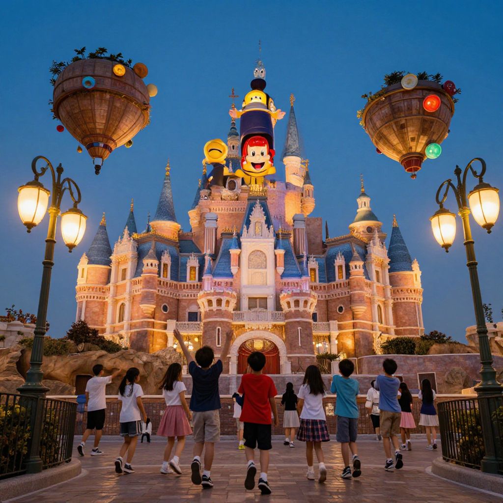 Photograph of a brightly lit Disney castle at dusk, with children in colorful clothes walking towards it, surrounded by glowing lanterns and whimsical hot air