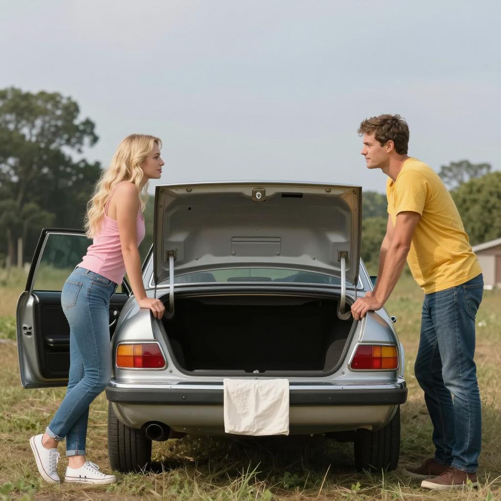 Photograph of three people near a yellow car. A blonde woman in blue jacket and white pants reaches out to two men. One man in a beige flat cap, plaid vest, and gray pants stands with a brown backpack. The other man in a white flat cap, beige sweater, and blue jeans. Background includes a brick building, green fence, and trees. Yellow car is to the right, with a bent bike wheel on the ground.