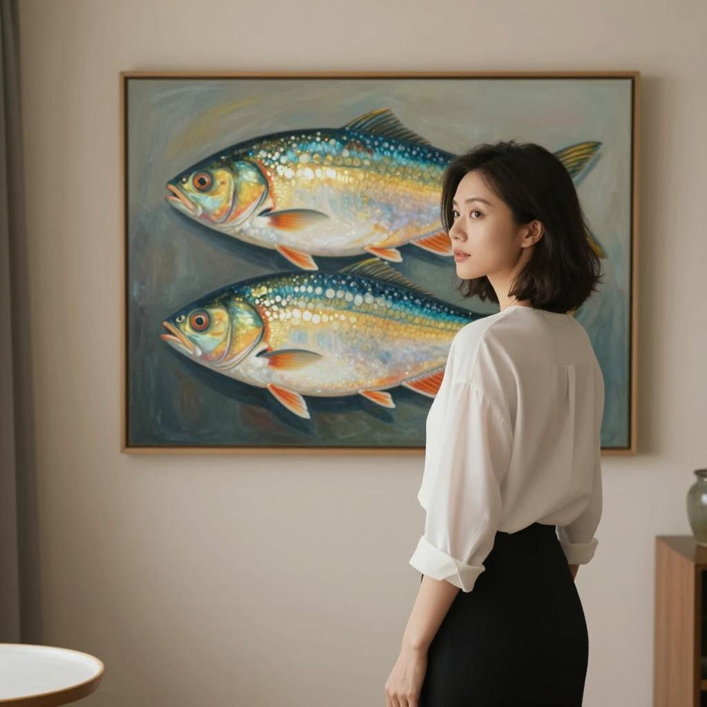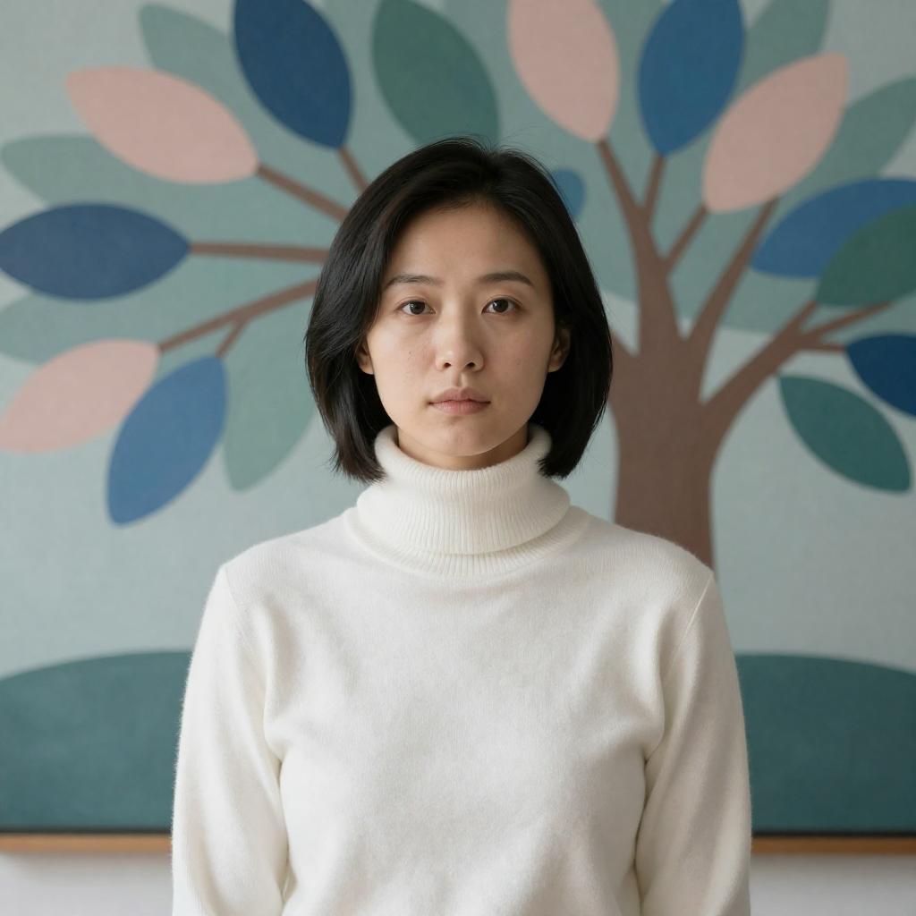 Asian woman with short black hair, wearing a white turtleneck sweater, standing in front of a colorful abstract painting. Painting features a tree with blue, pink, and green leaves, and ured brown branches. Woman's expression is neutral.