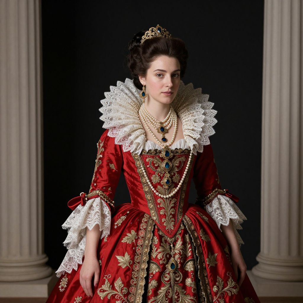 Photorealistic portrait of a regal woman in a red and gold Renaissance-style dress with intricate lace collar and pearl jewelry, set against a dark background