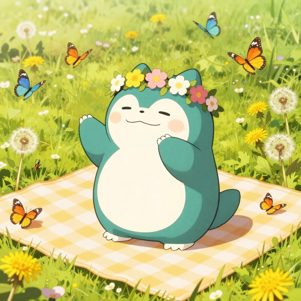 Happy Snorlax enjoying a vibrant spring picnic in a meadow filled with butterflies and dandelions, wearing a flower crown, soft lighting with warm hues, uplifting and joyful, anime-inspired, highly detailed environment