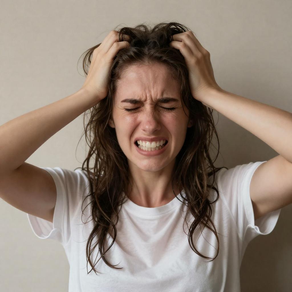 Photograph of a distressed woman with wet, disheveled brown hair, clenched teeth, and closed eyes. She is gripping her hair with both hands. She wears a white t-shirt. Background is a rough, beige wall. Her expression is intense pain or anguish.