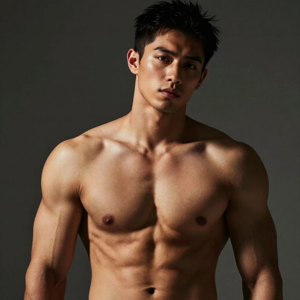 Cowboy shot, solo, stocky muscular man with olive complexion and buzzed black hair, topless male, large pectorals, abs, veiny arms, jet black, amber gold, slight grin, one hand resting on hip, jeans, denim texture, grey background