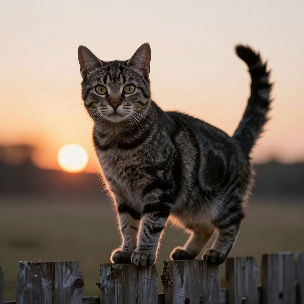 Black and gray striped cat perched on a rustic wooden fence at sunset, soft glowing light, detailed fur texture, whimsical style