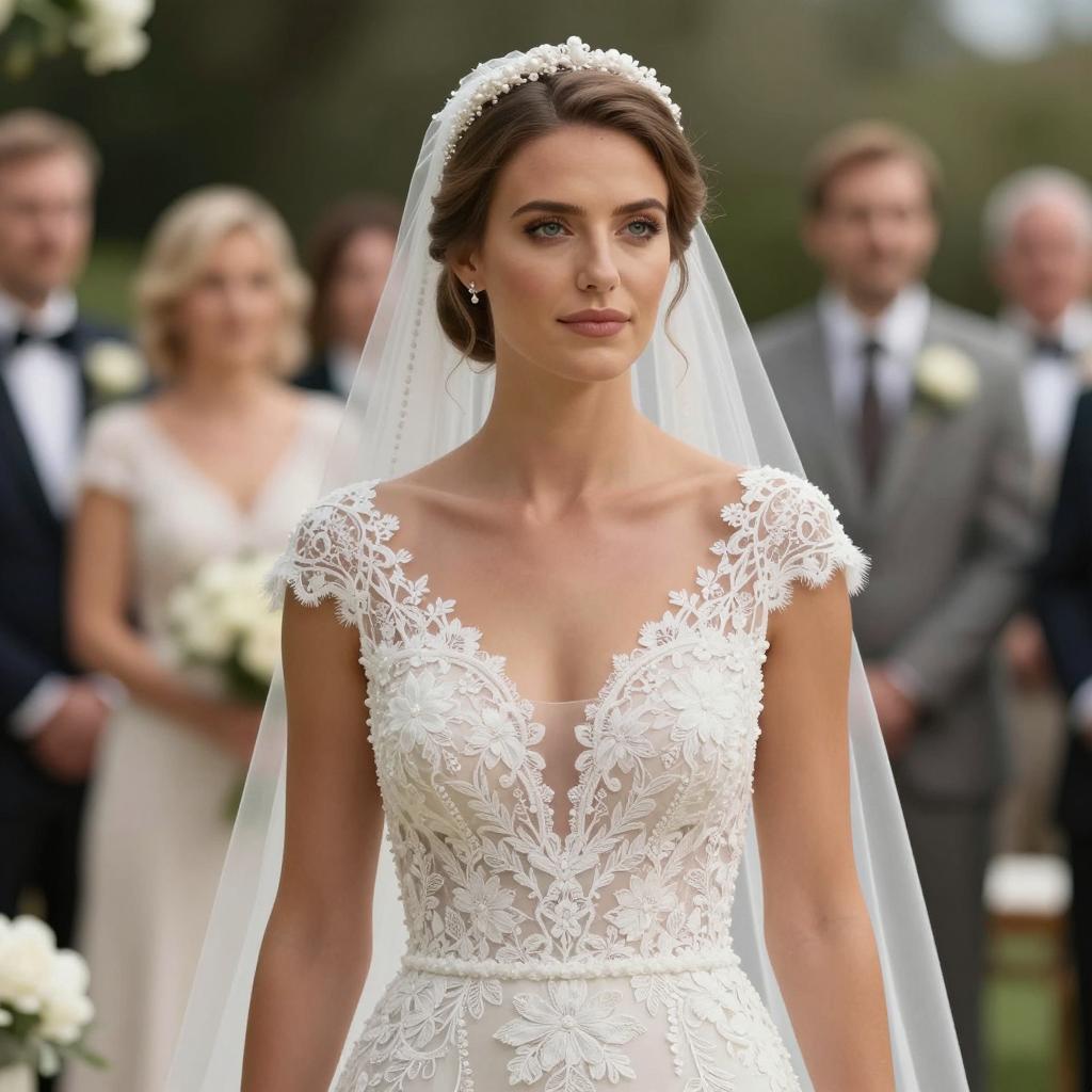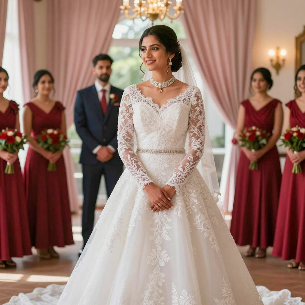 Frock design wedding party, photograph of a beautiful Indian bride in a white lace wedding dress with long sleeves and a choker necklace, standing in a sunlit room, soft pink draped curtains in the background, blurred groom in a dark suit and bridesmaid in a red dress holding a bouquet of red flowers, chandelier hanging from the ceiling, warm and elegant atmosphere, daytime, natural light, bride smiling, hands together, detailed lace pattern on dress, slight updo hairstyle, natural makeup, indoor wedding setting