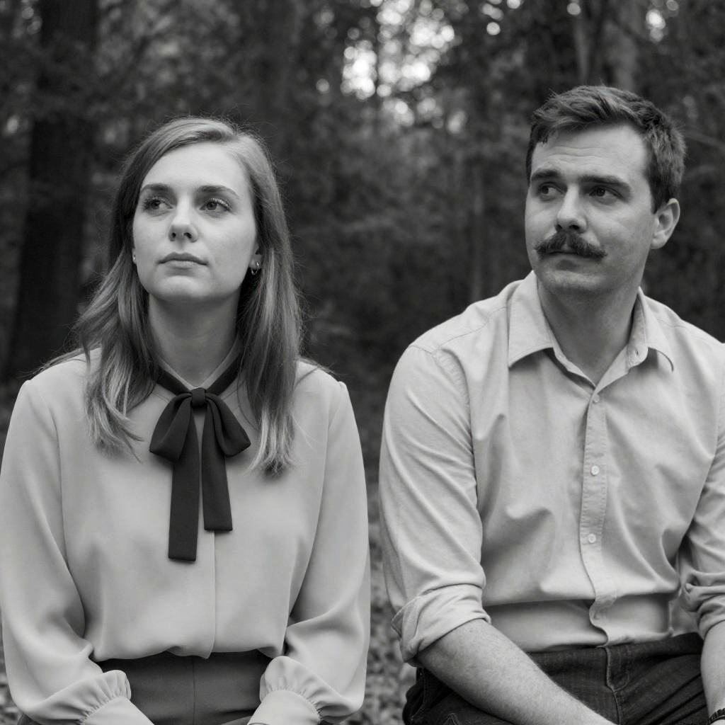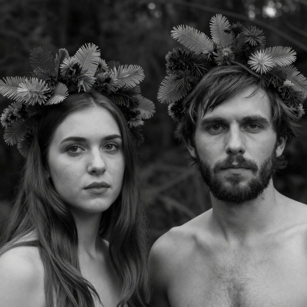 Black and white photograph of two people with forest-themed headpieces. Both shirtless, with facial expressions neutral. Woman with long hair on left, man with beard and messy hair on right. Background is dark, wooded. Woman looks to the side, man looks forward.