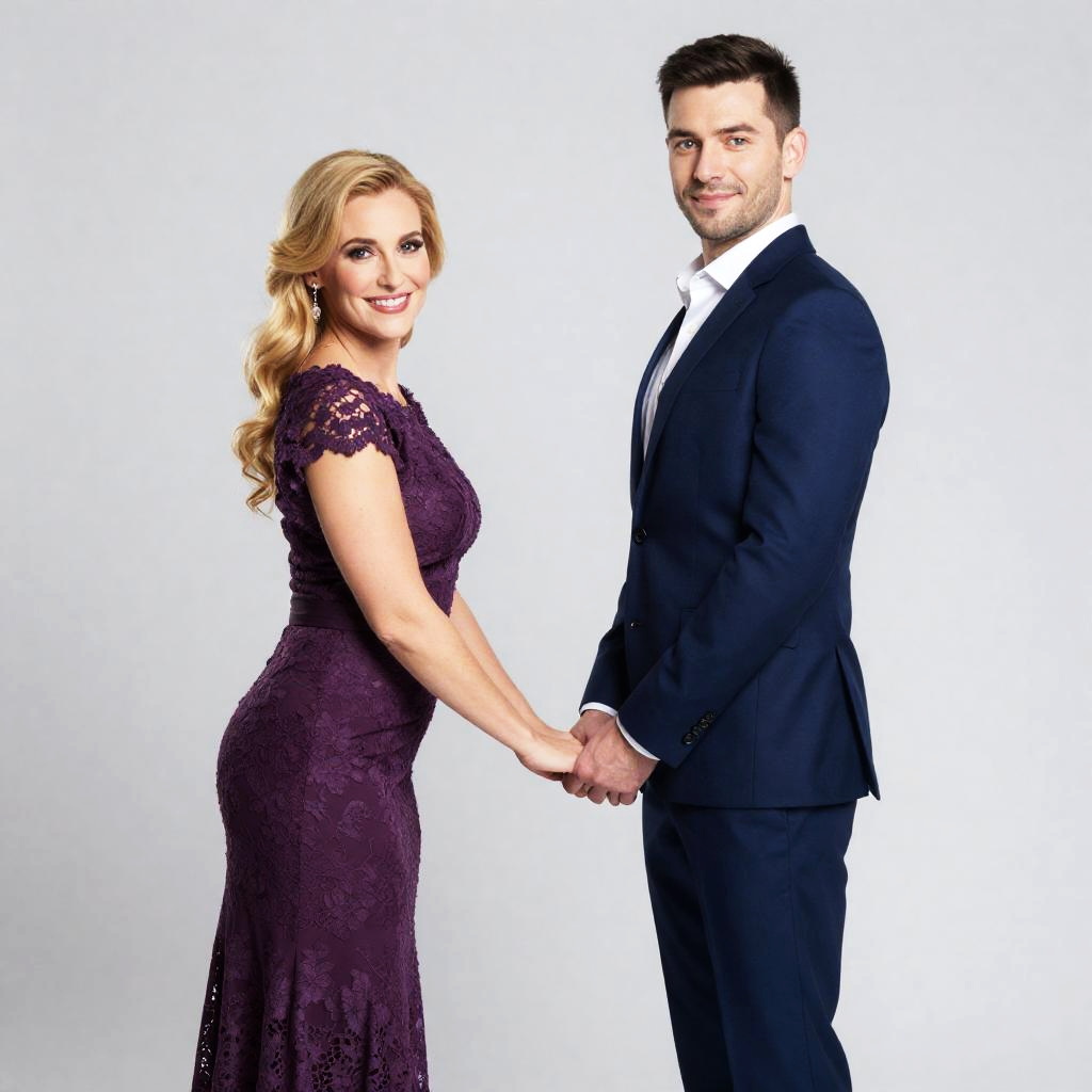 Photograph of a blonde woman in a purple lace dress and a dark-haired man in a blue suit, standing side by side. She leans forward, smiling, holding his hands. He stands straight, smiling. White-to-gray gradient background.