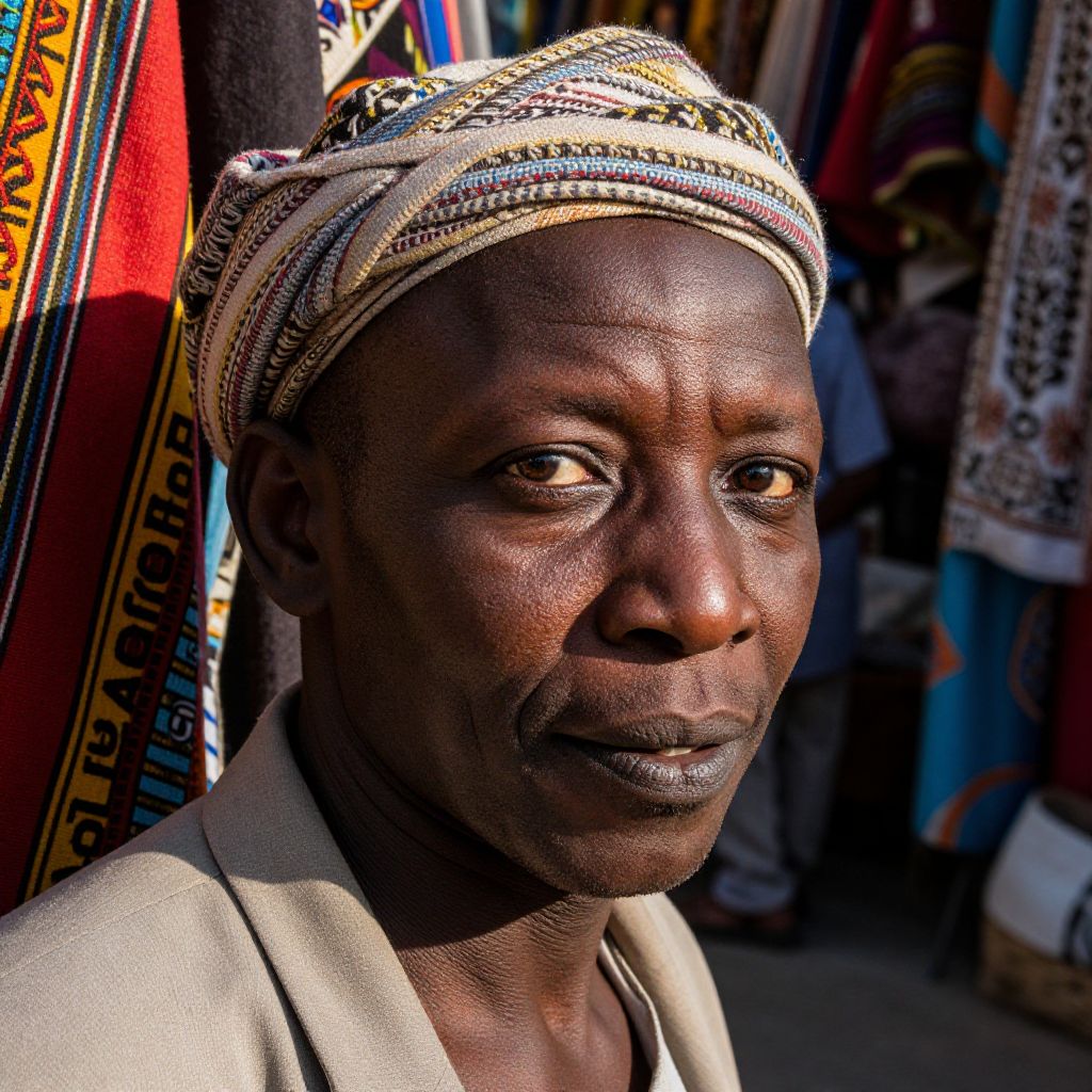 An ultrarealistic portrait showcases a 45-year-old African man with mahogany skin, high cheekbones, and intense dark eyes, captured in an intimate close-up that emphasizes his serene yet captivating expression. A subtle smile reveals a dimple on his left cheek as he appears deep in thought amidst the lively North African marketplace. Warm sunlight casts long shadows across the vibrant fabrics draped around him, illuminating the intricate patterns of his woven turban. This evocative image seamlessly blends candid street photography with hyperrealistic digital art, inviting viewers to explore the depths of human experience and uncover the layers of culture, history, and emotion reflected in a single timeless gaze.