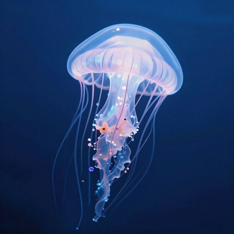 Photograph of a glowing, translucent jellyfish with white and pink accents, floating in a deep blue ocean background.