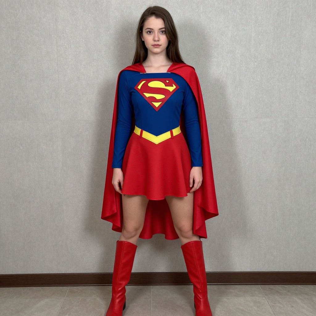 "girl supergirl costume, 1girl, solo, cape, long hair, brown hair, red cape, boots, skirt, full body Realistic photo of casual sexy person with pretty face"