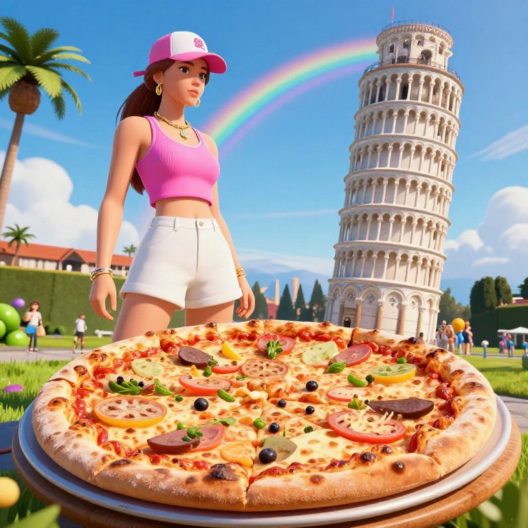 CGI image of a young woman in pink top and white shorts, with pink cap, standing by a large pizza beside the Leaning Tower of P
