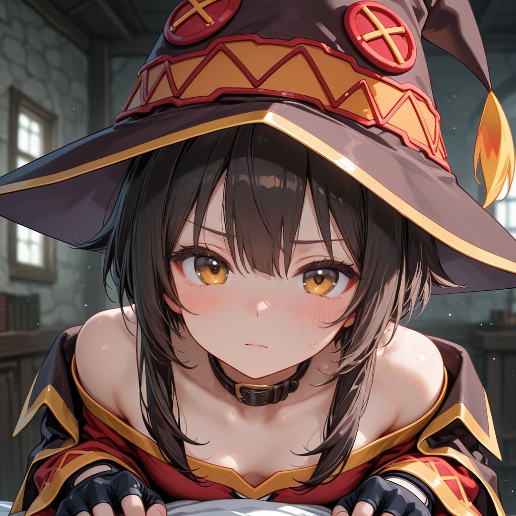 Botw style, megumin, 1girl, bare shoulders, black cape, black gloves, black hair, blush, cape, choker, collarbone, dress, hair between eyes, hat, long sleeves, looking at viewer, medium hair, off-shoulder dress, off shoulder, red dress, red eyes, sidelocks, solo, witch hat