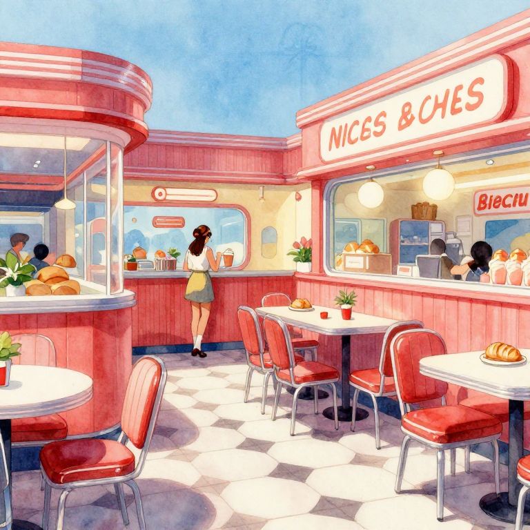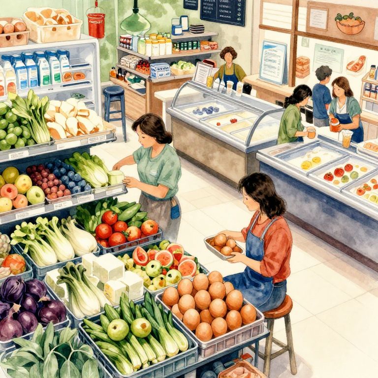 Action inside a shop with fresh produce, dairy, eggs, tables filled with people, ice cream counter, watercolor,