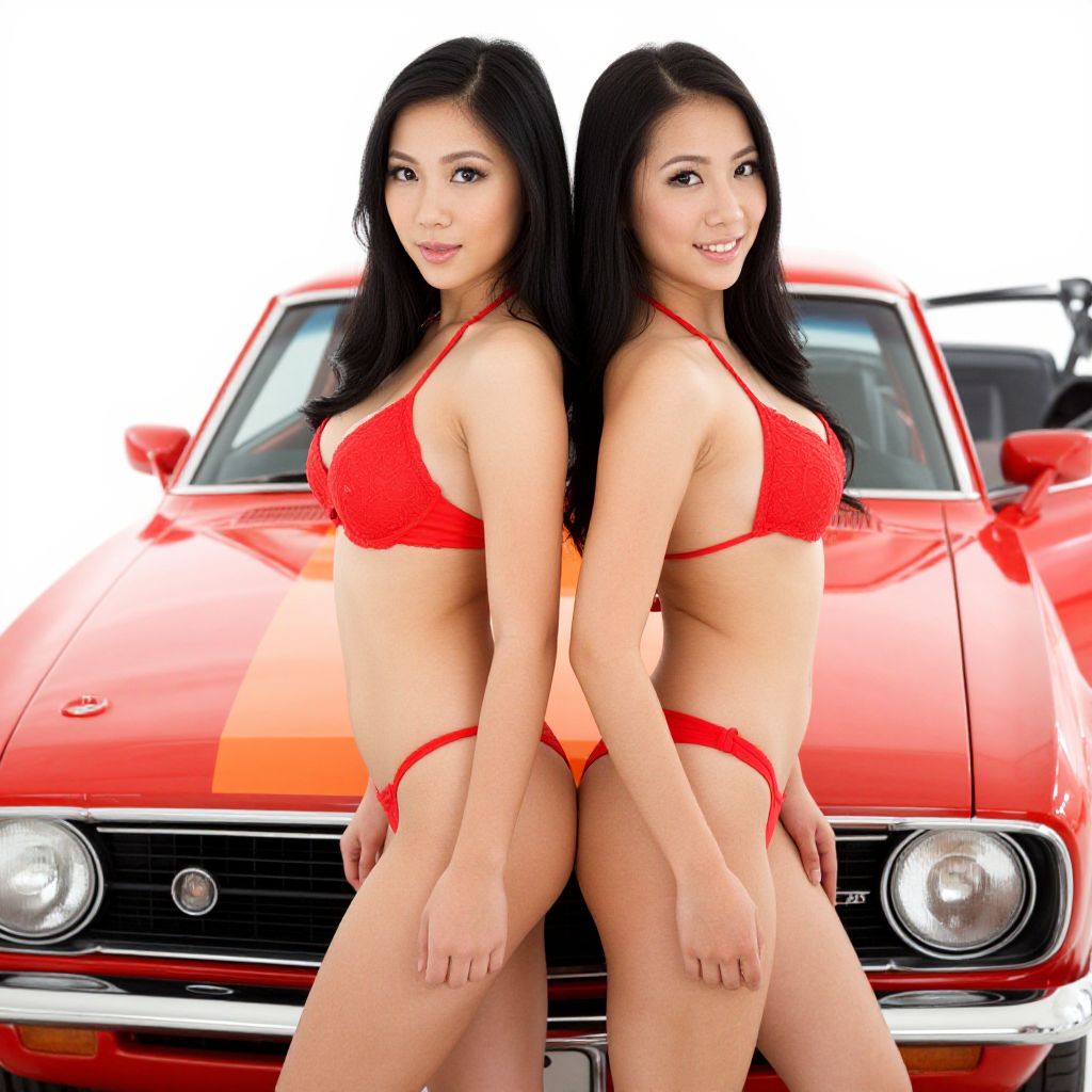 Photograph of a tall, fit woman with long black hair, tan skin, and a confident expression, standing next to a bright red classic muscle car with its hood open. She wears a red bikini top that accentuates her large breasts, black high-waisted shorts, white wristbands, and silver high-heeled sandals. The car has shiny chrome details, black tires, and a visible engine. The background shows an industrial area with a fenced building and overcast sky. The image is vibrant with strong contrasts between the red car and her outfit.
