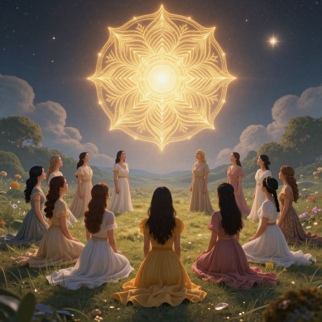 Digital art depicting a night scene with a group of 11 women in flowing, pastel-colored dresses, seated on grass with their backs to the viewer. They gaze at a glowing, intricate, golden mandala-like light in the starry sky. The women have varying hair colors and styles, and the grassy field is dotted with flowers. The background features a horizon of trees and distant mountains under a dark blue sky with scattered stars and clouds. The image has a dreamlike, ethereal quality.