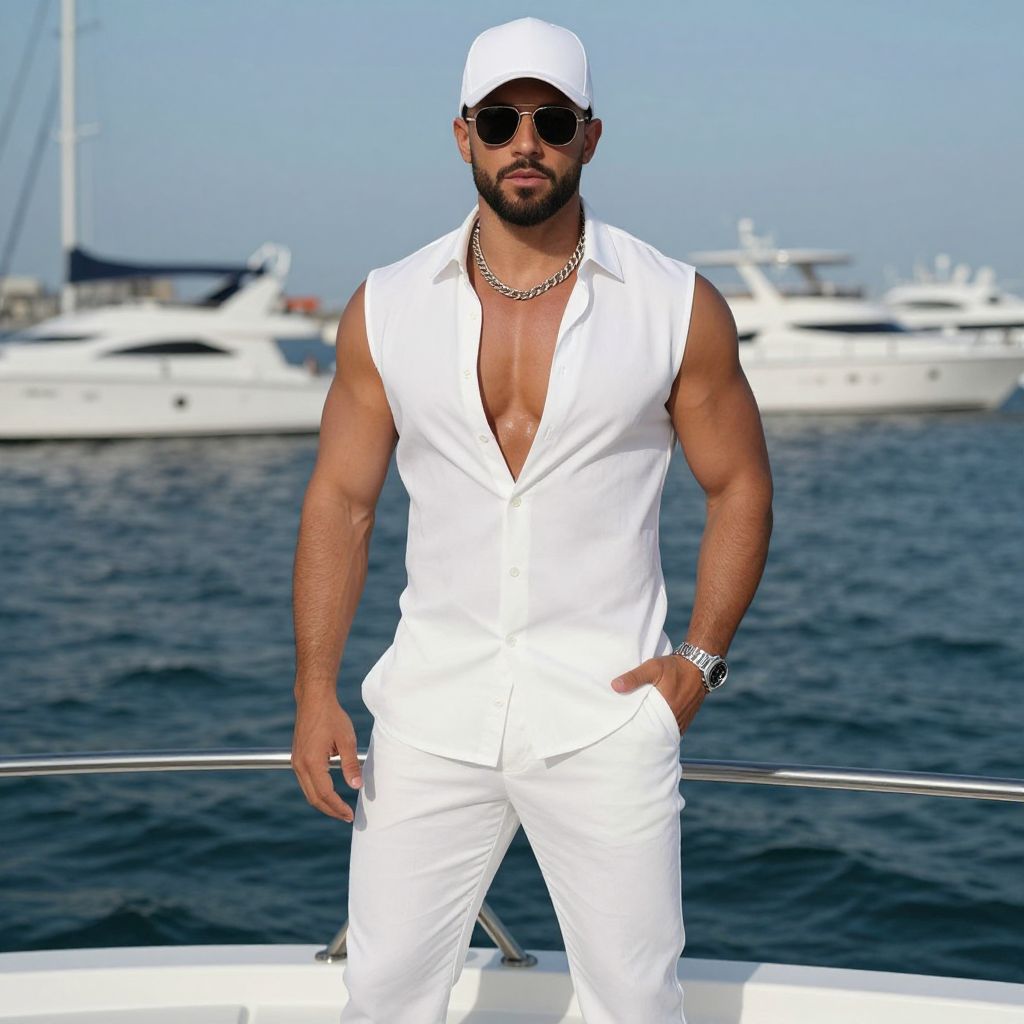 Yacht party outfit male, 1boy, male focus, solo, hat, sunglasses, facial hair, pants, jewelry, necklace, shirt, pectorals, watch, beard, baseball cap, pectoral cleavage, sleeveless, hand in pocket, white pants, muscular, bara, looking at viewer, white shirt, standing, wristwatch, feet out of frame, muscular male