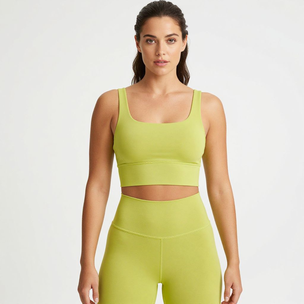 Photograph of a fit, fair-skinned woman with dark hair in a ponytail, wearing a bright yellow sports bra and high-waisted leggings