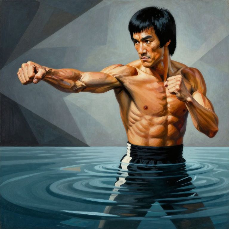 Closeness : Bruce Lee punching frontal floating water in a Surreal cubism painting by artist Salvador Dali and Boris Vallejo,
