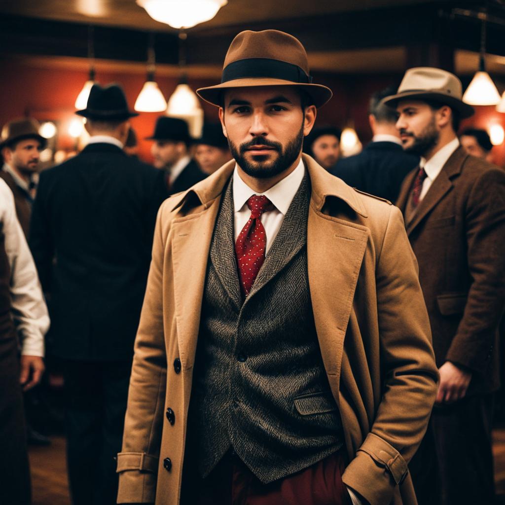 Portrait of a man wearing a brown fedora hat, beige trench coat, herringbone grey vest, white collared shirt, and red necktie. The background features a blurry vintage-style speakeasy setting with other men dressed in period attire, evoking the 1920s-1930s era.