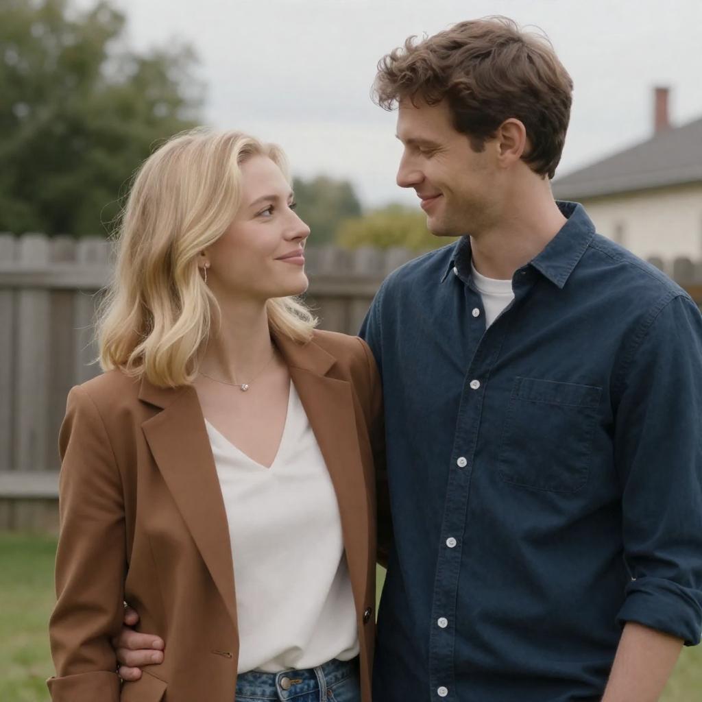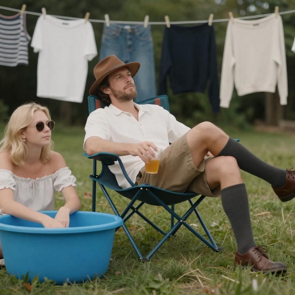Photograph of two people relaxing on grass. Man with brown hat, white shirt, brown shorts, and knee-high socks reclines in a folding chair, holding a drink. Blonde woman in off-shoulder top and sunglasses sits nearby, next to a blue plastic tub. Clothes hang on a line in the background.