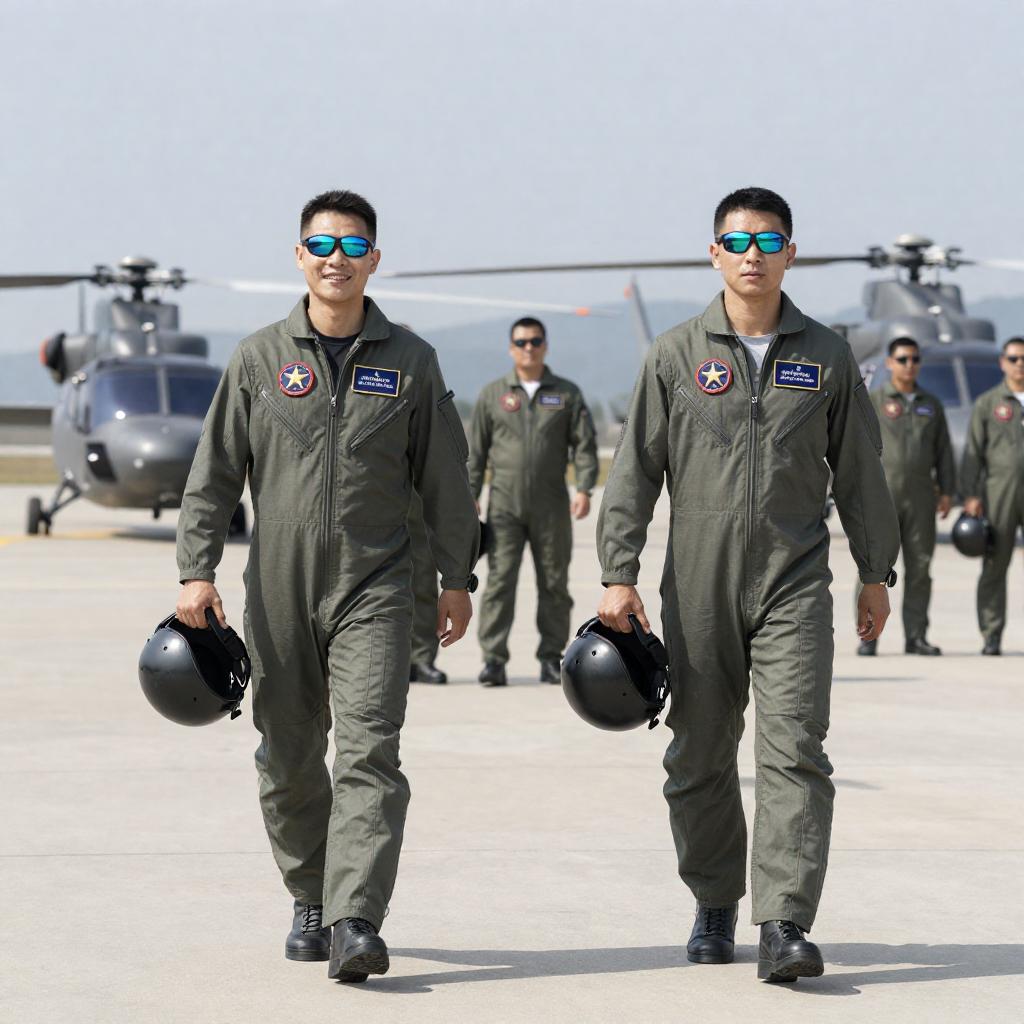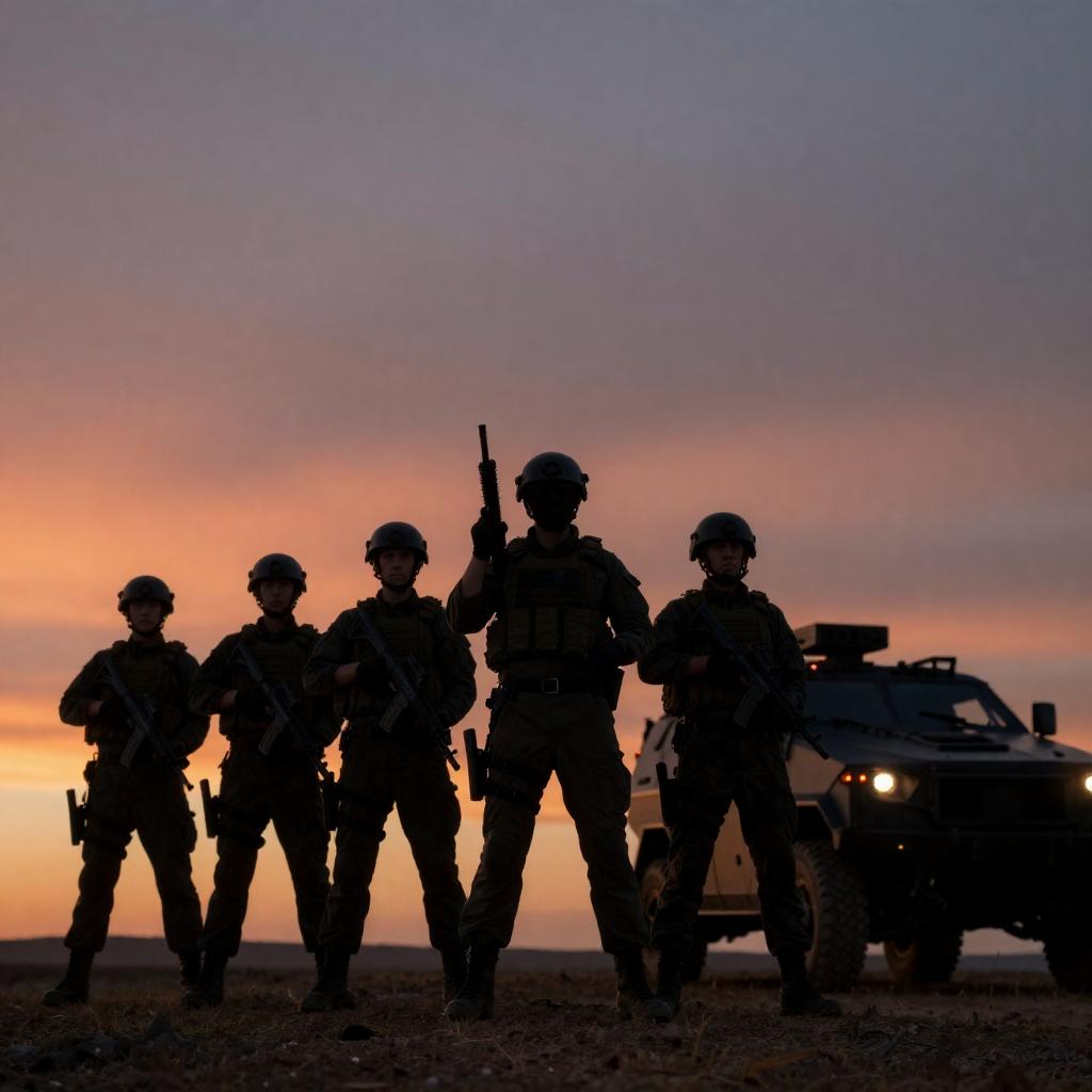 Photograph of a large military aircraft with twin engines, viewed from the front. Silhouetted figure on the right, holding a bag, walks away from the plane. Orange-brown sky and illuminated ground in the background. Aircraft's landing gear and propellers visible.