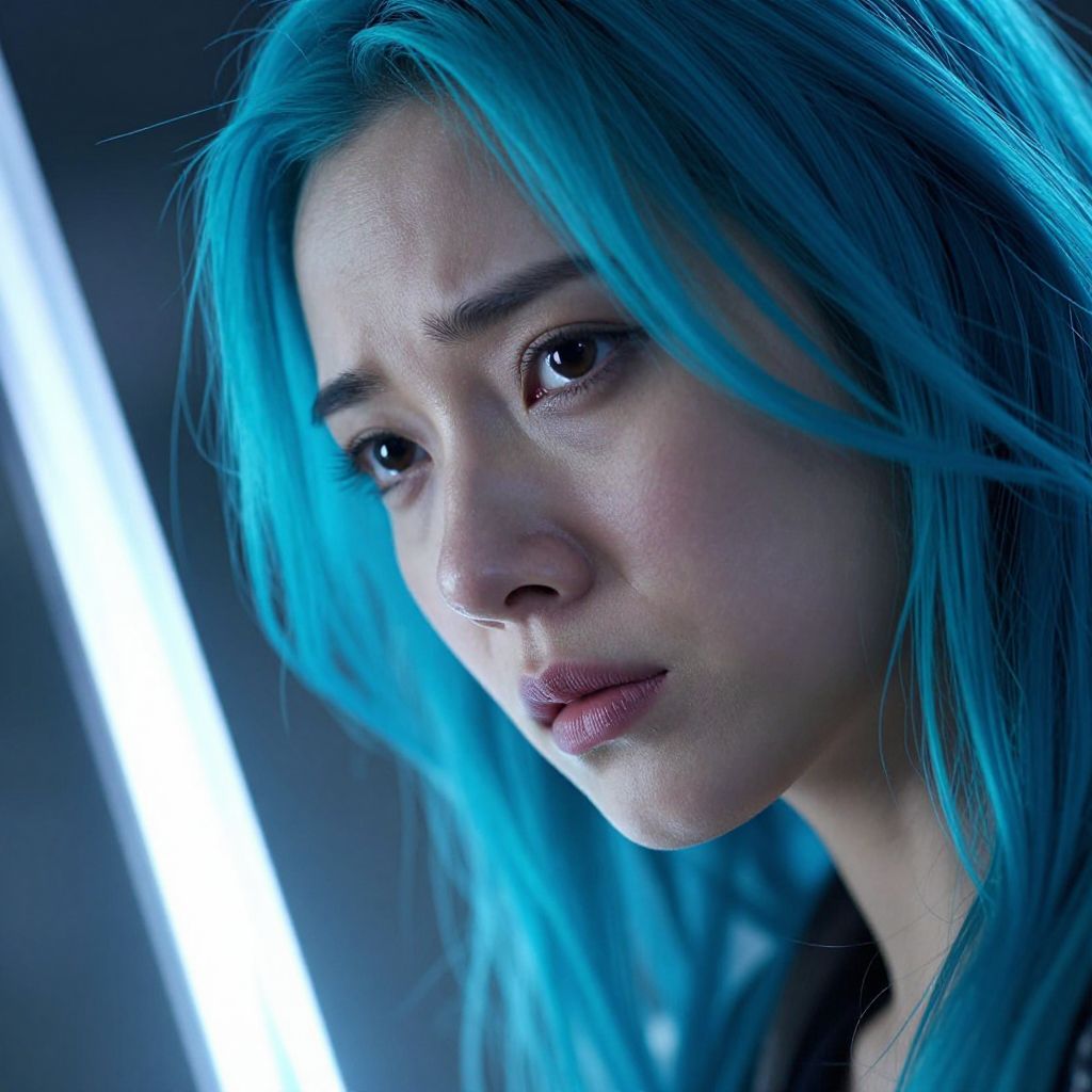 A dramatic close-up of the woman's face, her aqua-blue hair cascading over one side, partially obscuring her sorrowful yet determined expression, The camera angle is slightly tilted upward from her left side, emphasizing the intensity of her sharp features, mirroring the radiant glow of the sci-fi sword in the blurred background, The lighting creates stark shadows and highlights, giving a cinematic contrast that enhances her resolve and the futuristic, emotional atmosphere