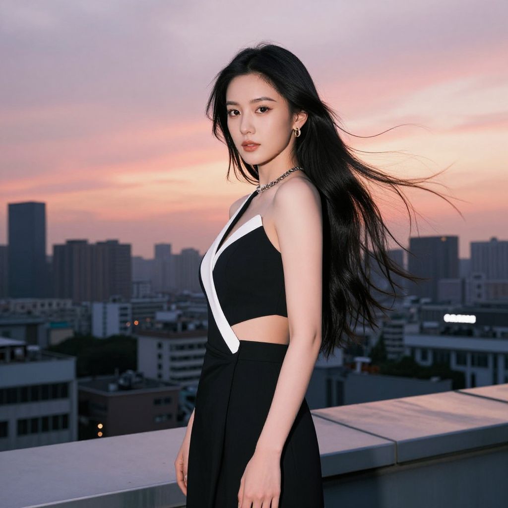 Photograph of an Asian woman with short black hair, wearing a sleeveless, high-neck black dress adorned with a sparkling choker. She stands against a blurred ocean and sky backdrop, with two seagulls flying in the background. Her makeup is subtle, with a focus on red lips. The image has a slight digital enhancement effect, making the colors appear slightly over-saturated. The seagulls are in mid-flight, adding a dynamic element to the otherwise calm scene. The woman's expression is neutral, and she stands confidently with her arms relaxed by her sides.