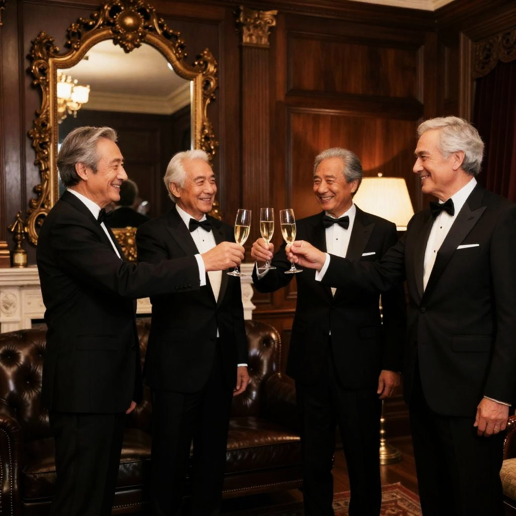 Four older men in black tuxedos, standing in a luxurious wooden-paneled room, raising their champagne glasses in a toast. Large ornate mirror, leather armchair, and floor lamp in background. Men have gray hair, smiling, and are close together. Rich, dark-toned decor.