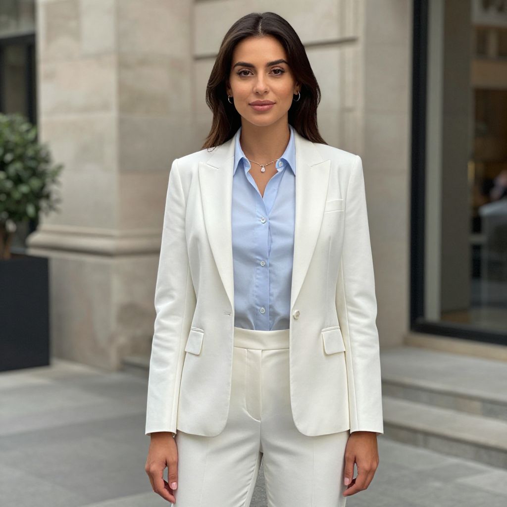 Photograph of a woman with long, dark brown hair and medium skin tone standing outdoors in front of a stone building. She wears a white, tailored suit with a light blue button-up shirt underneath, and a thin gold necklace. Her expression is neutral, and she stands with a slight forward lean. The background includes a blurred view of a potted plant on the left and a window on the right. The overall style is professional and modern, with a focus on clean, crisp lines and a monochromatic color scheme accented by the light blue shirt.