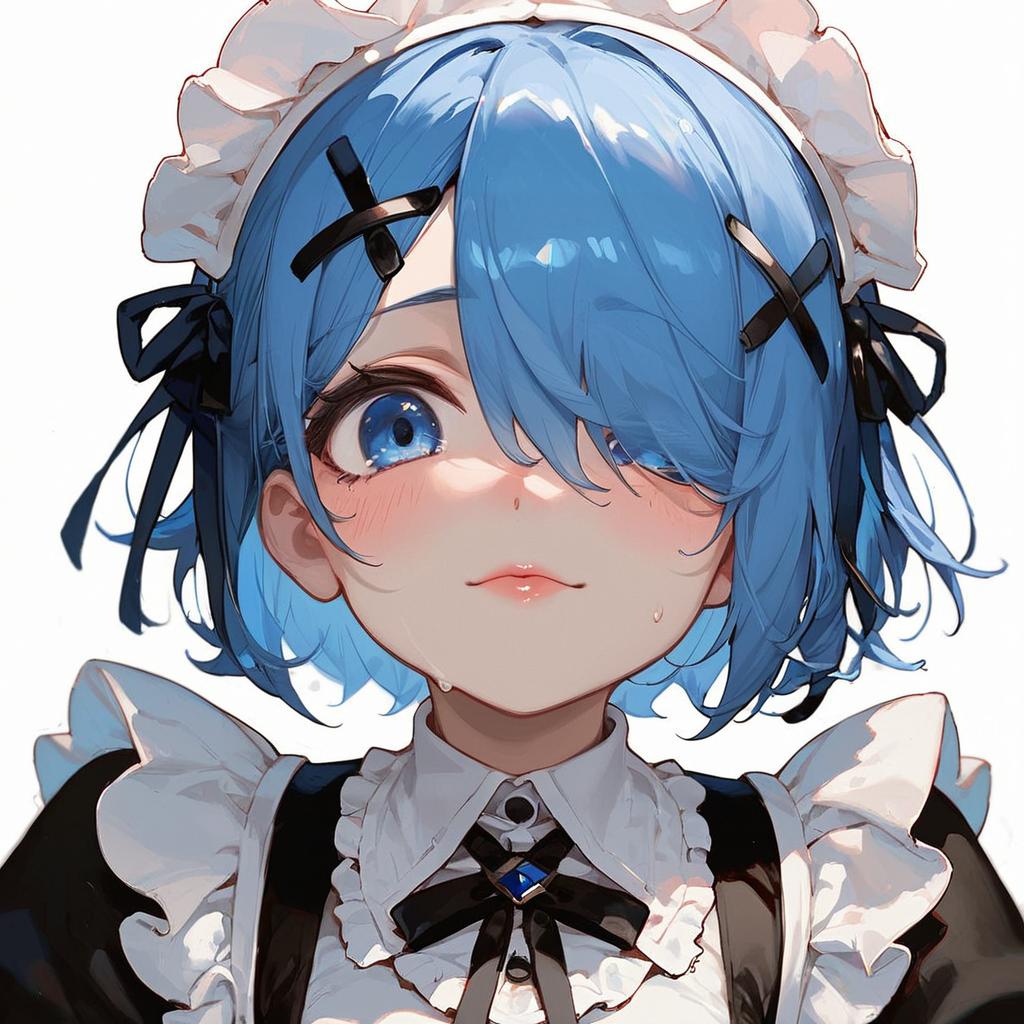 Score_9, score_8_up, score_7_up, source_anime, rezeroram, ram, hair flower, hair ornament, hair over one eye, pink hair, red eyes, short hair, x hair ornament, apron, black bow, black dress, black ribbon, bow, detached sleeves, dress, frilled apron, frilled sleeves, frills, juliet sleeves, long sleeves, maid, neck ribbon, puffy sleeves, ribbon, roswaal mansion maid uniform, thighhighs, two-tone dress, waist apron, white bow, white dress, white thighhighs, indoors, looking at viewer, dutch angle, cowboy shot