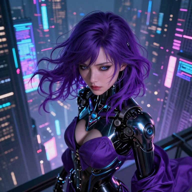 A digital CGI image of a futuristic, cyberpunk-style woman with purple hair and glowing blue highlights. She's wearing a shiny, metallic bodysuit with black accents, puffy shoulder pads, and thigh-high boots. She's sitting on a glowing, round platform with blue neon lights, legs spread, and hands resting on the platform. The background is dark with vertical neon lights.