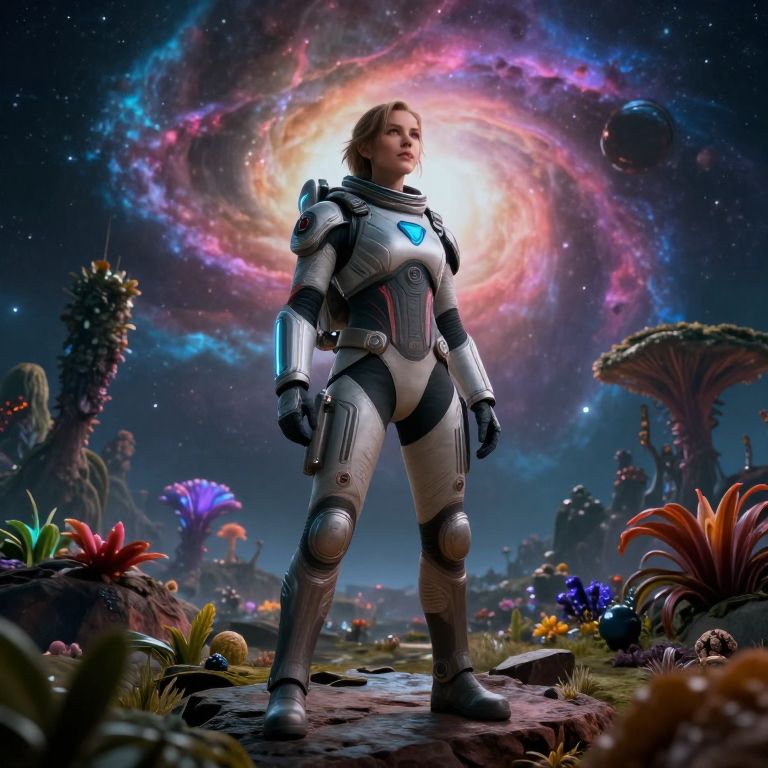 Photorealistic digital art depicting a young woman in futuristic, silver and black armor with a glowing blue chest emblem standing confidently in a vibrant, alien landscape. She has light brown hair, fair skin, and an athletic build. The background features a colorful, swirling galaxy with bright pink, purple, and orange hues, and an array of exotic, multicolored flora. Large, mushroom-like plants and other alien vegetation populate the foreground, adding depth and texture. The scene is illuminated by the galaxy's radiant light, casting a mystical glow over the entire composition. The woman stands with a strong, heroic stance, ready for action.