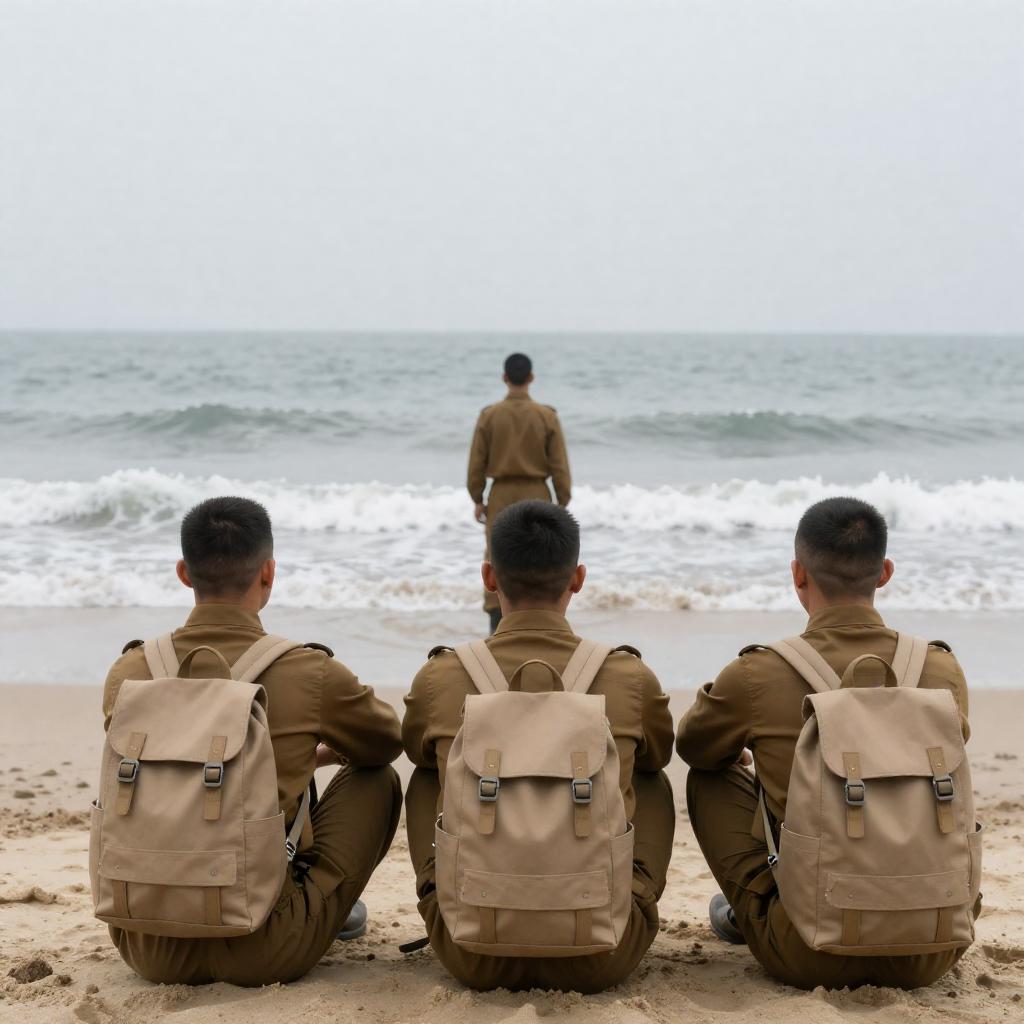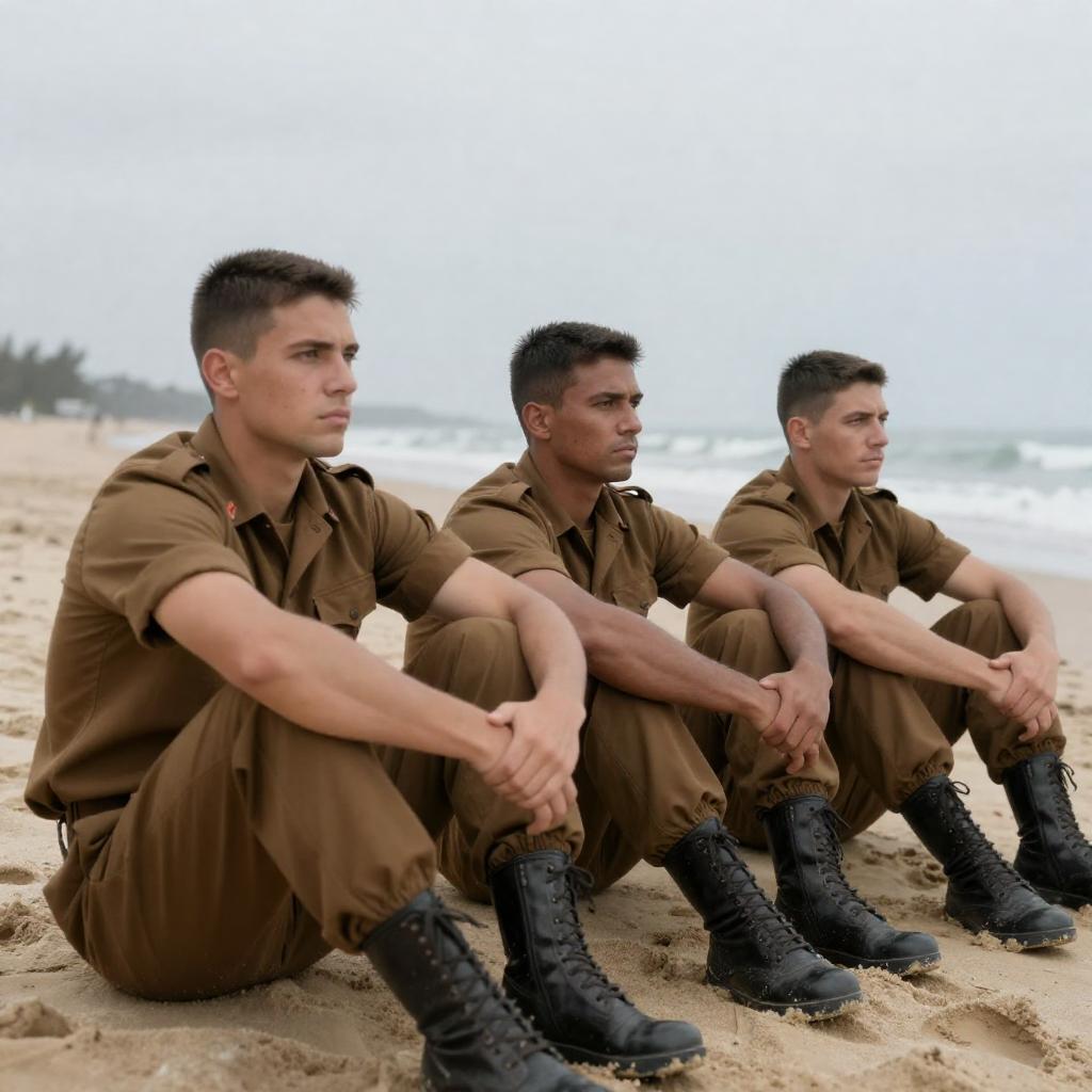 Photograph of three male soldiers in brown military uniforms sitting on a sandy beach with foamy waves. They have short dark hair, serious expressions, and are positioned in a row, with the leftmost soldier leaning forward. Overcast sky and distant structures in the background.