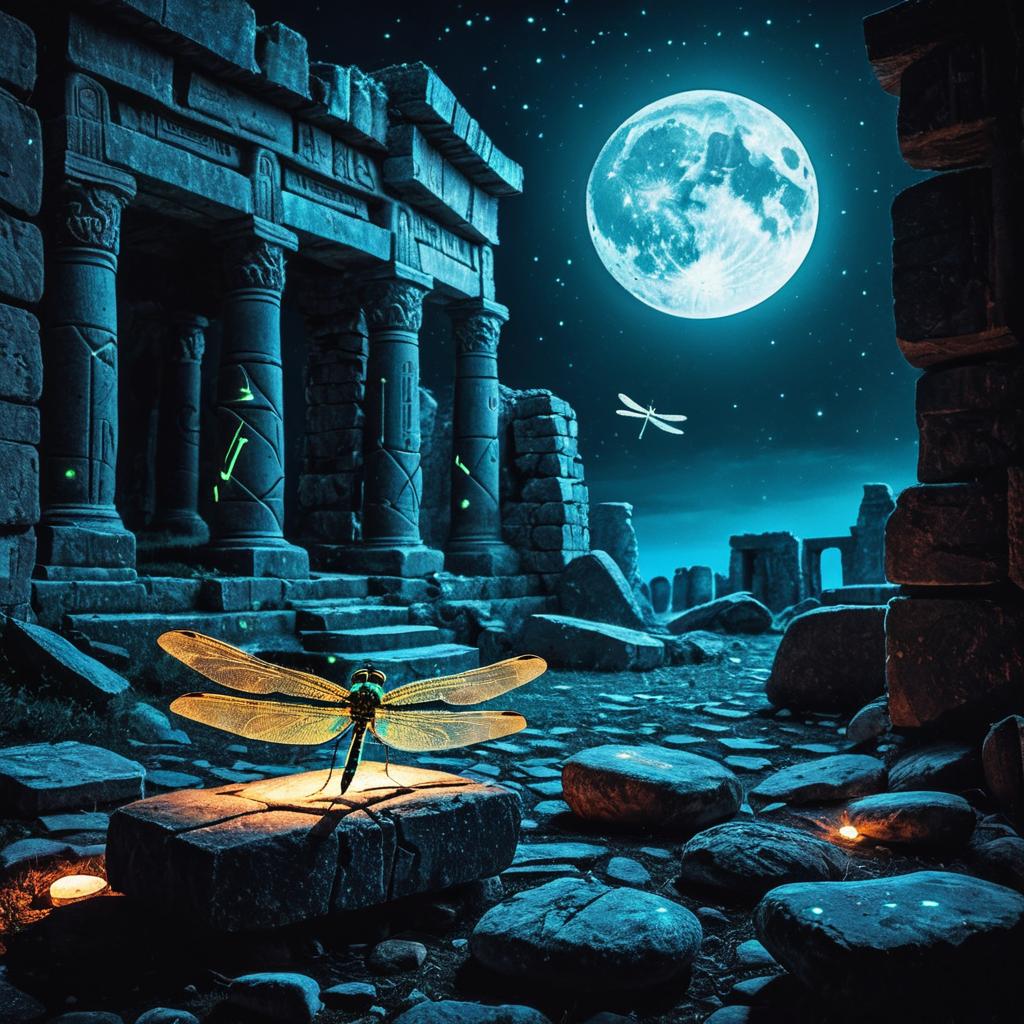 A surreal night scene depicting a dragonfly perched on a stone amidst ancient ruins under a bright full moon. The ruins feature glowing runes carved into the stones, illuminated by ethereal blue light. The atmosphere is mystical and dreamlike, with stars scattered across the sky and another dragonfly flying in the background.