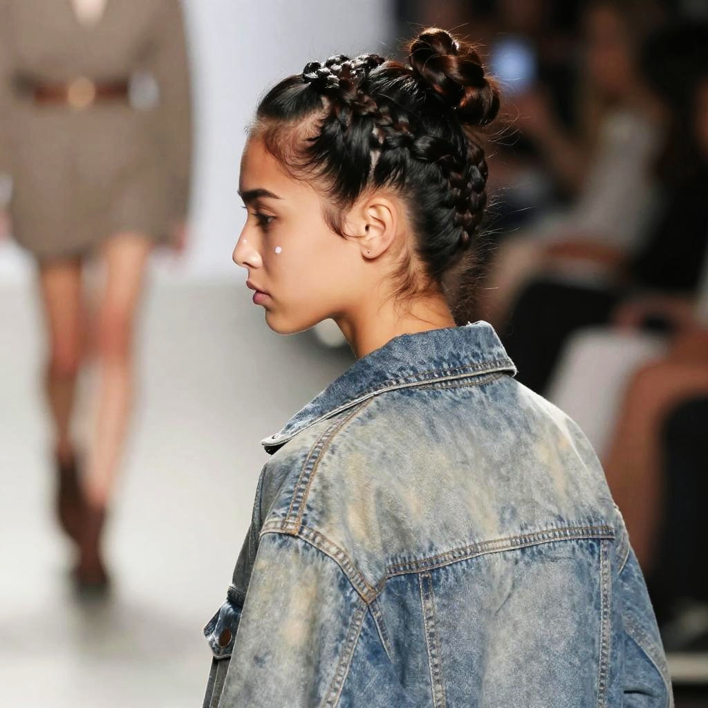 Braided Bun hairstyle on female artist, wearing casual outfit, in fashion runway, captured in fashion editorial style with glossy tone.