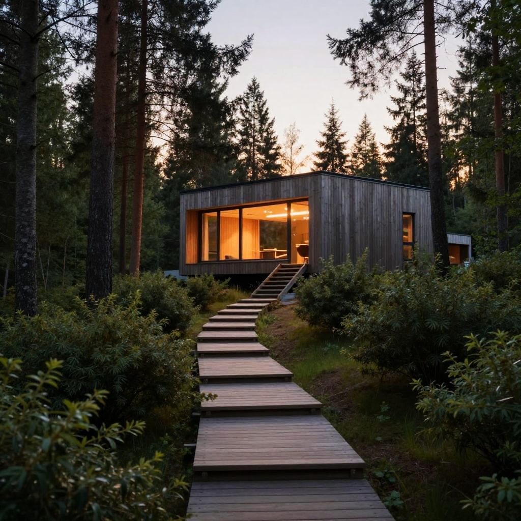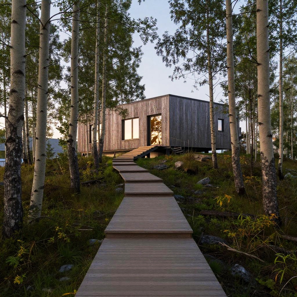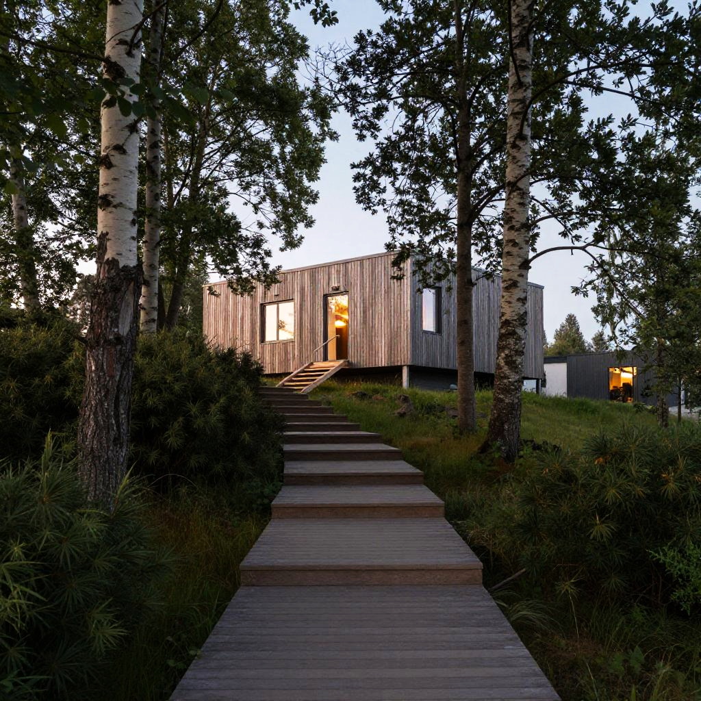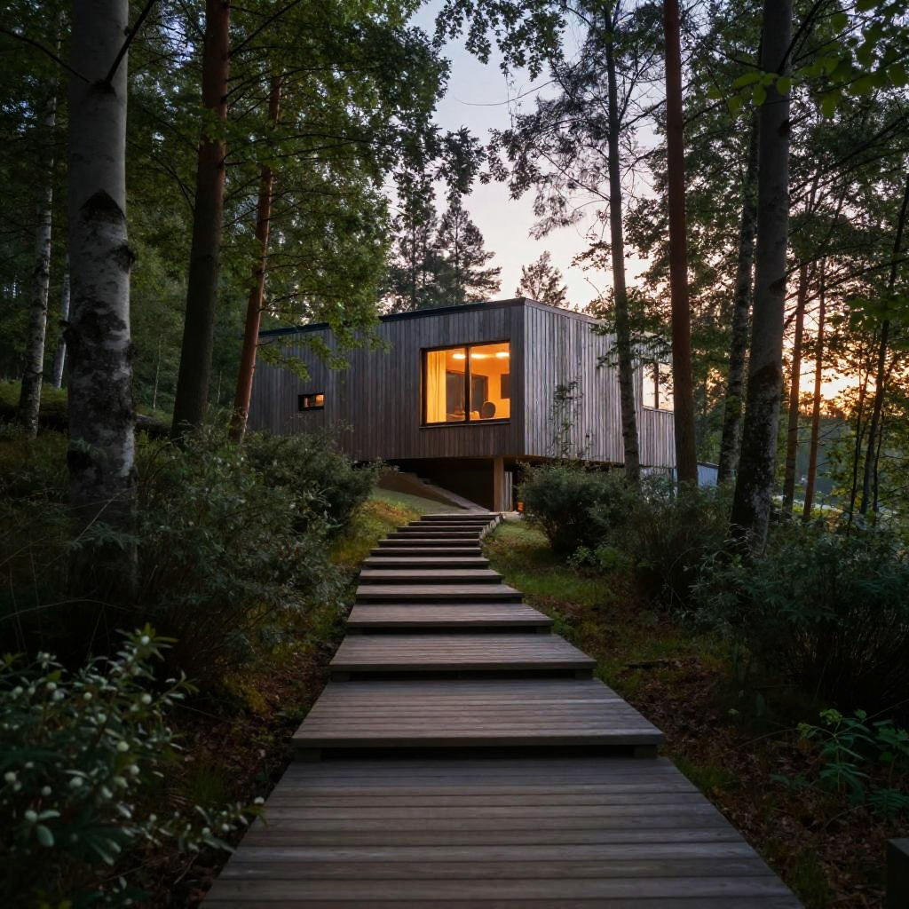 Dpi, a wooden path in a cypress forest, the narrow path curves between tall trees and hazel bushes, a little uphill with some wooden steps. Approaching a large modern wooden house with minimalistic horizontal style, flat roof, and large windows, lights glowing inside. Nordic summer night, sun is down, it is beginning to darken. 50mm f/8