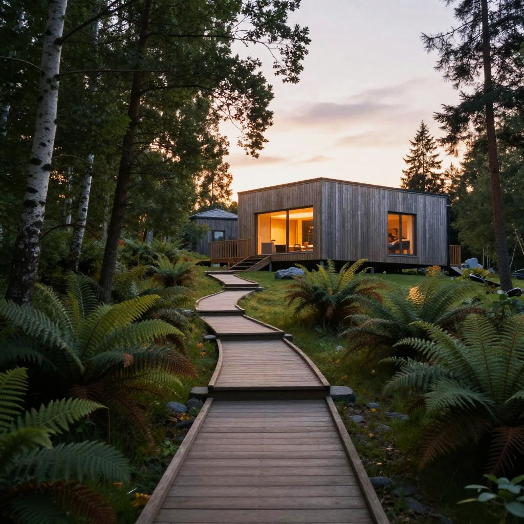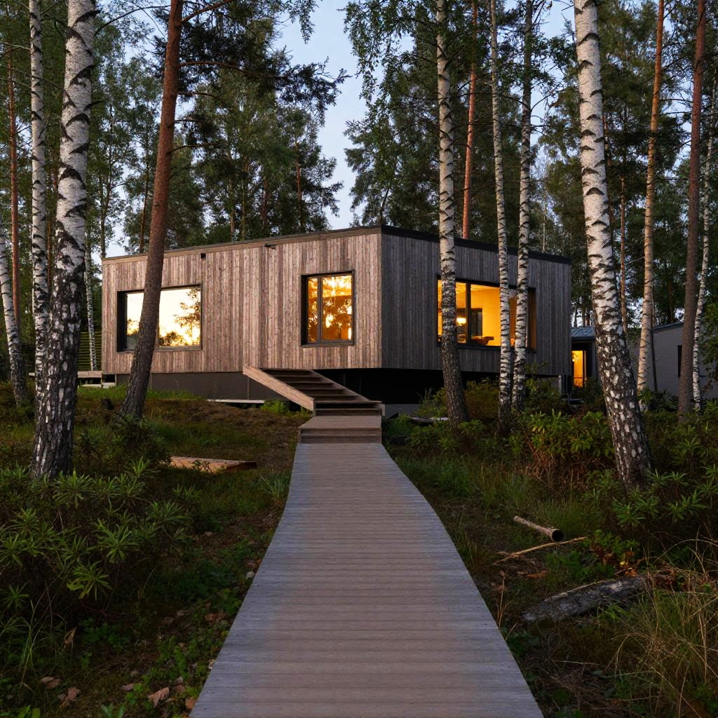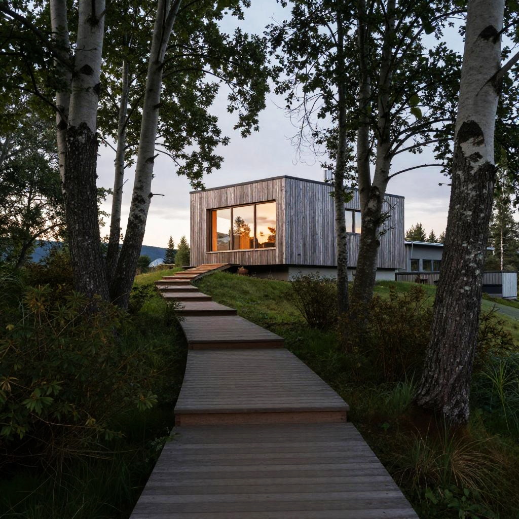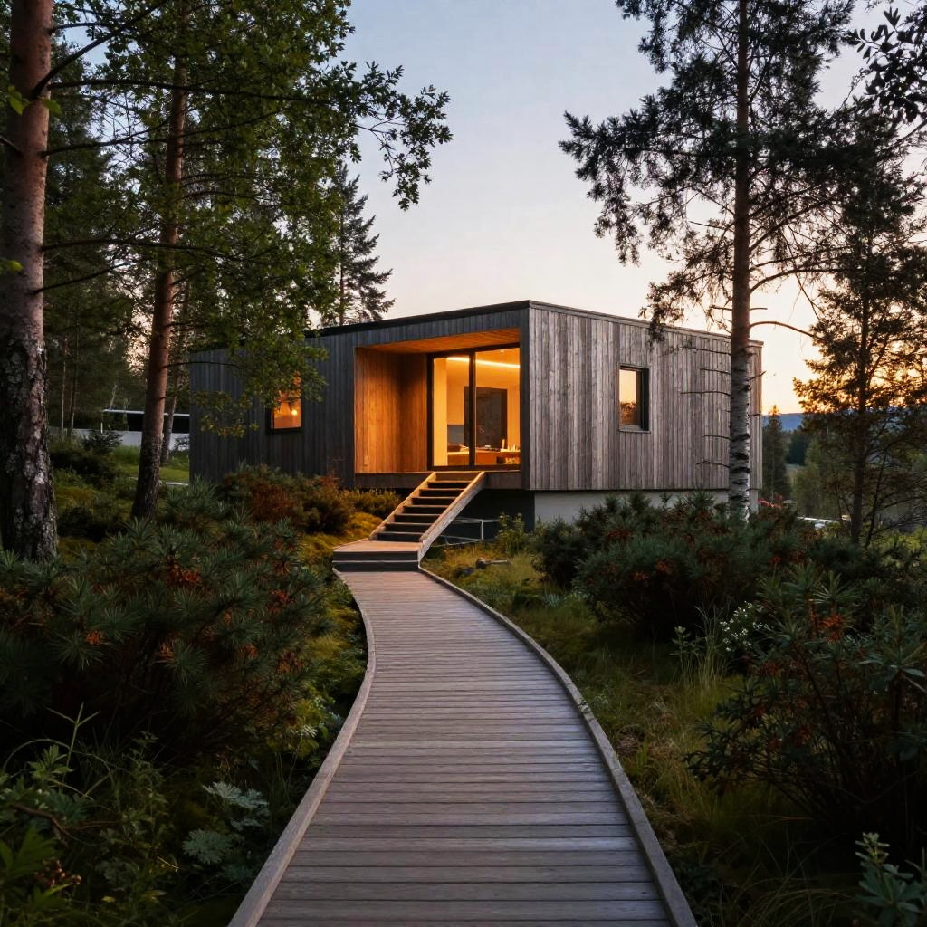 Dpi, a wooden path in a cypress forest, the narrow path curves between tall trees and hazel bushes, a little uphill with some wooden steps. Approaching a large modern wooden house with minimalistic horizontal style, flat roof, and large windows, lights glowing inside. Nordic summer night, sun is down, it is beginning to darken. 50mm f/8