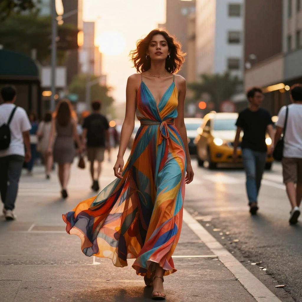 3/4 body pose of a confident woman standing in a bustling city street at sunset, wearing a flowing dress, vibrant colors, cinematic lighting, ultra-realistic detail