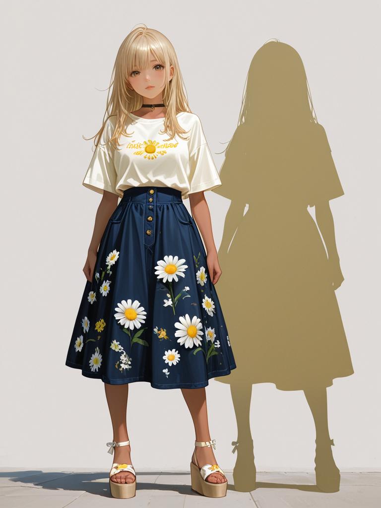 This digital illustration features a young woman with blonde, shoulder-length hair and fair skin, standing against a plain white background. She wears a white, short-sleeved t-shirt with a large yellow daisy graphic on the chest, and a high-waisted, dark blue skirt adorned with large white daisies and yellow centers. She has a black choker around her neck and white platform sandals with ankle straps. Her shadow, rendered in a beige hue, is cast behind her on the right. The illustration uses bold, clean lines and vibrant colors, with a slightly anime-inspired style. The overall composition is simple yet striking, focusing on the contrast between the colorful outfit and the white background.