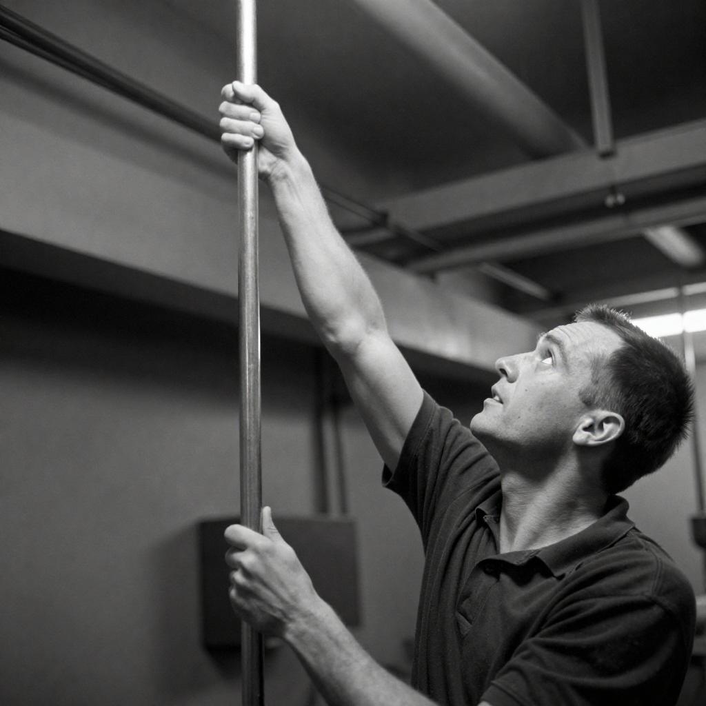 Black-and-white photograph of a man reaching upward with his right arm, grasping a metal rod. He has short hair, an intense expression, and is wearing a dark shirt. Background shows complex overhead wiring, pipes, and industrial equipment. Man is positioned to the right, background is cluttered.