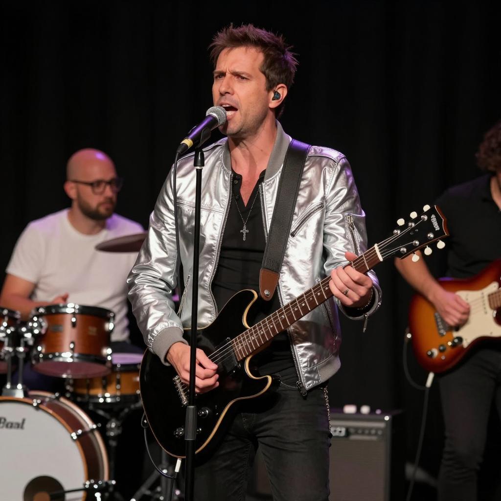 Man in a shiny silver jacket and black pants sings into a microphone while holding a black electric guitar. Background includes a drummer in a white shirt and a bald man with glasses. Dimly lit stage, drummer's drum kit partially visible. Man in foreground has short, dark hair, intense expression, mouth open mid-sentence. Two other musicians in background.