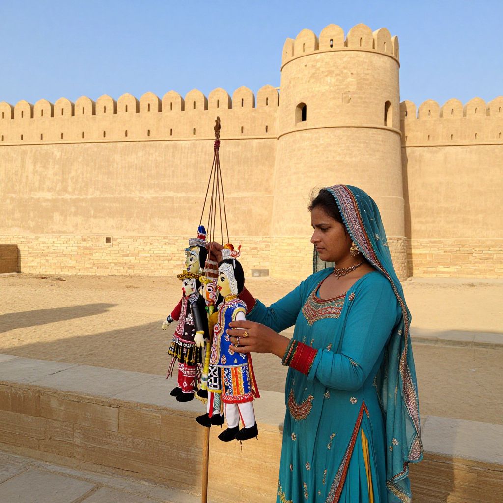 Indian woman in blue saree with red bindi, sitting in desert, arranging colorful doll figures in front of ancient fort.
