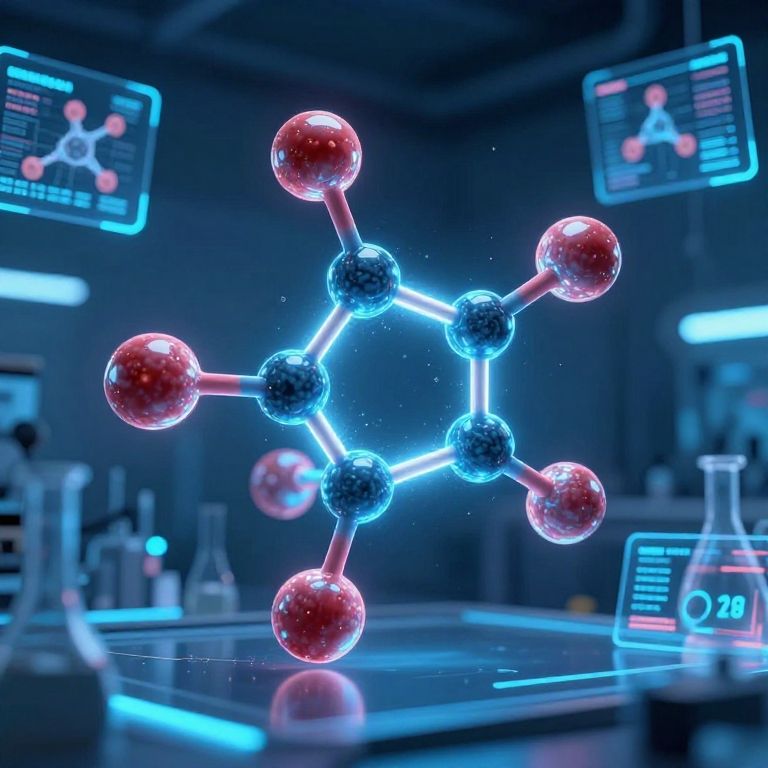 Photograph-like CGI of a molecular structure with glowing neon blue and red spheres connected by bright blue lines. The background is a futuristic lab with blurred, glowing screens displaying molecular diagrams and scientific data. The lab has a sleek, high-tech appearance with illuminated surfaces and various scientific equipment, including a flask labeled "2.8" on the right. The image has a cybernetic, sci-fi aesthetic with vibrant colors and a dynamic composition.