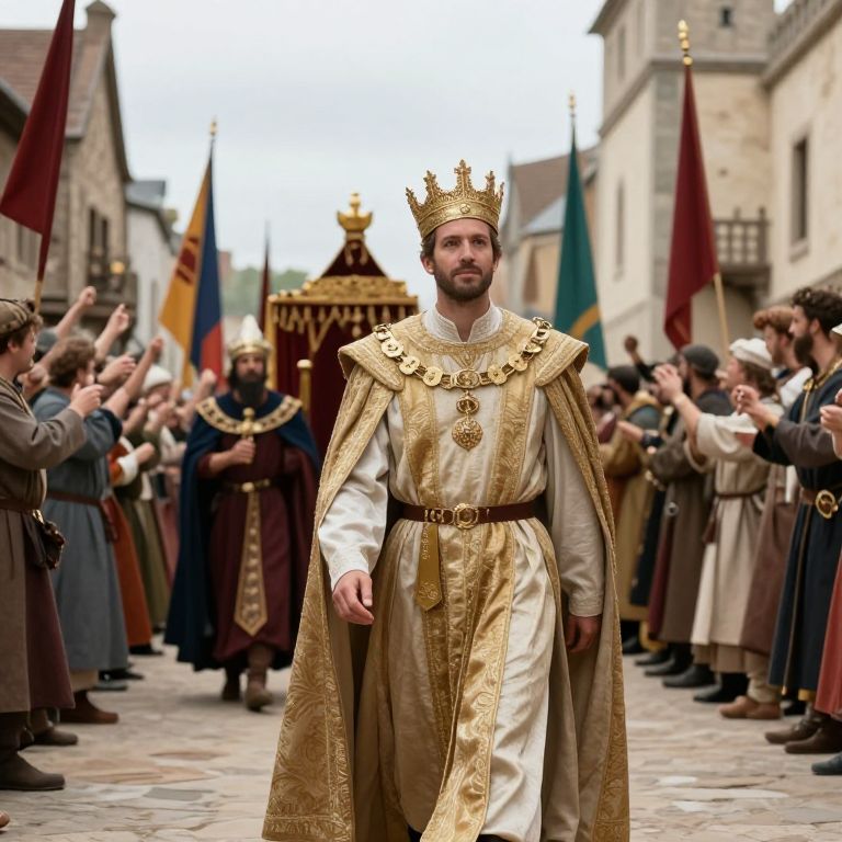 Epic scene of a regent overseeing a royal procession through a bustling medieval city square, dressed in opulent robes and a golden chain of office, with citizens cheering and colorful flags fluttering, illustrating authority and public admiration.