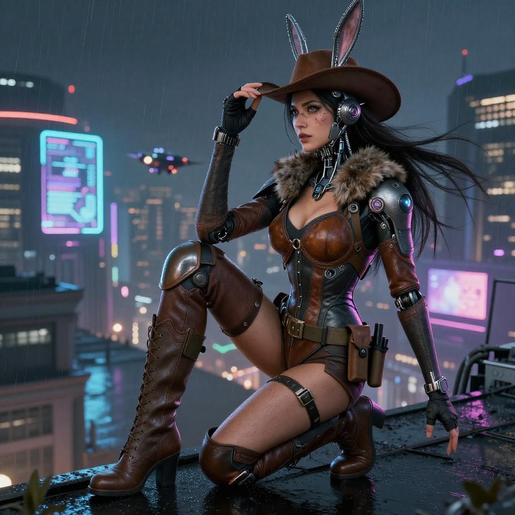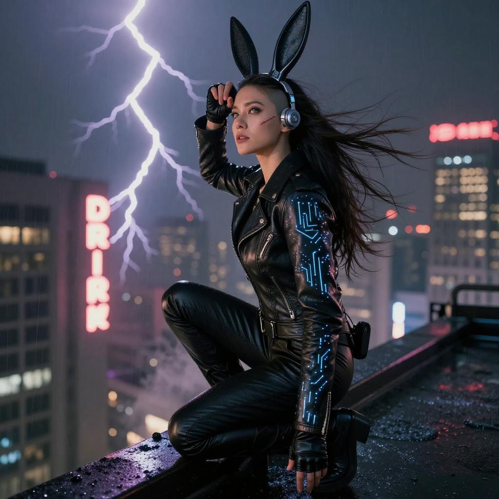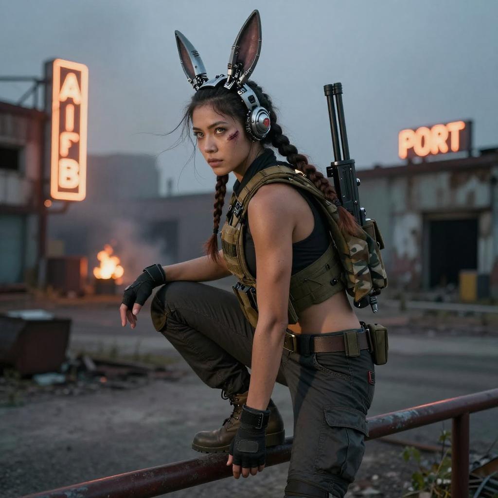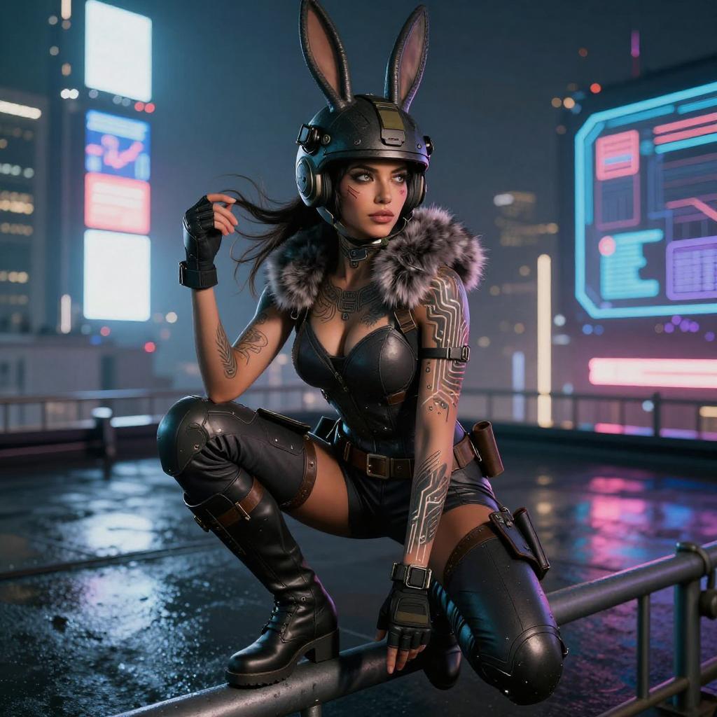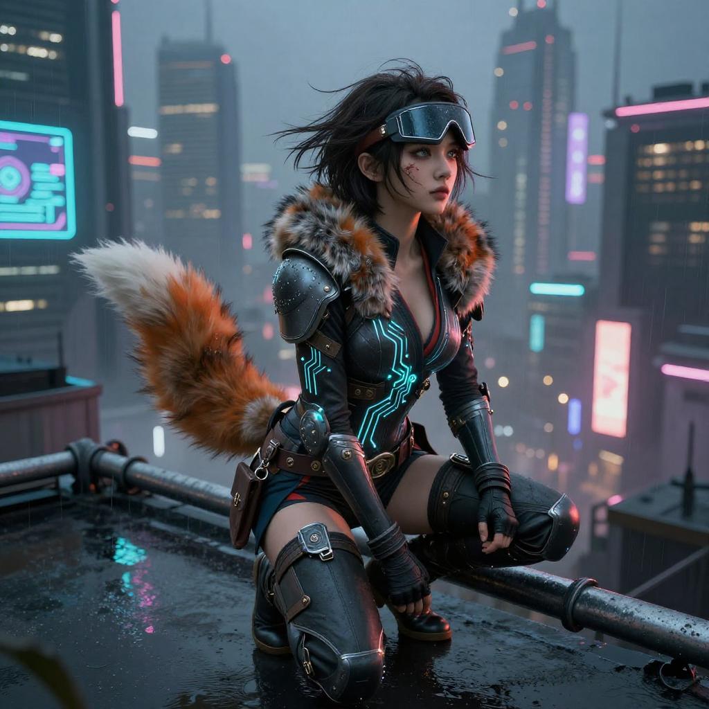 Ultra-detailed, 8k, masterpiece, 1 woman (solo:1.3), textured skin, beautiful detailed face, luminous detailed eyes, detailed pupils, dynamic pose, dynamic angle, squatting on railing, full body, cowboy shot, from above, from behind, (looking away:1.3), ambient light, realistic shadows, rim light, depth of field, bokeh, sharp focus, wind-swept accents, cinematic composition, athletic cyberpunk archer with fox-shaped cybernetic ears, short cropped hair, lithe muscular build, faint cheek scar, quiver of high-tech arrows on her back, armored leather corset, asymmetrical long coat with glowing blue trim, thigh-high armored boots, fingerless tactical gloves, utility belt with electromagnetic arrow launcher, rain-slick neon rooftop at dusk, holographic billboards and drifting fog, puddles reflecting neon signs, distant monorail lines and towering spires on the skyline
