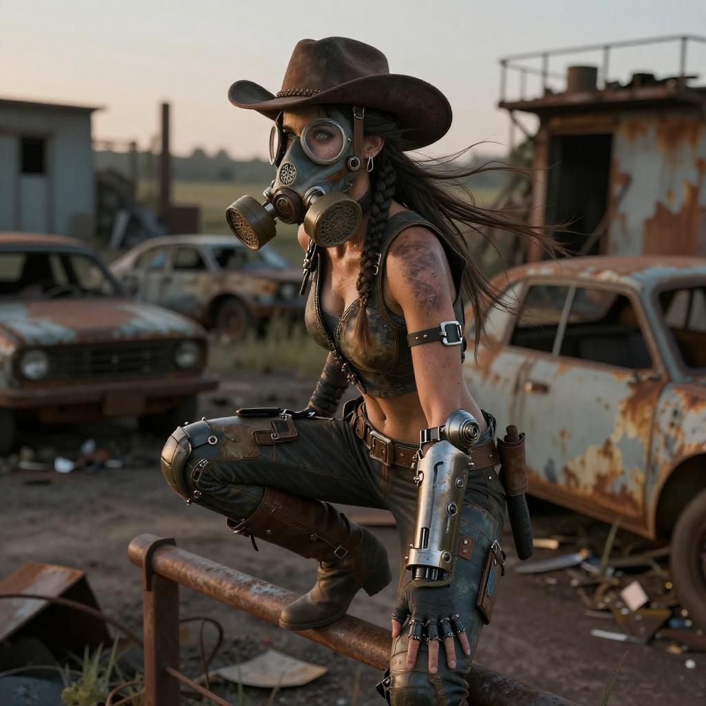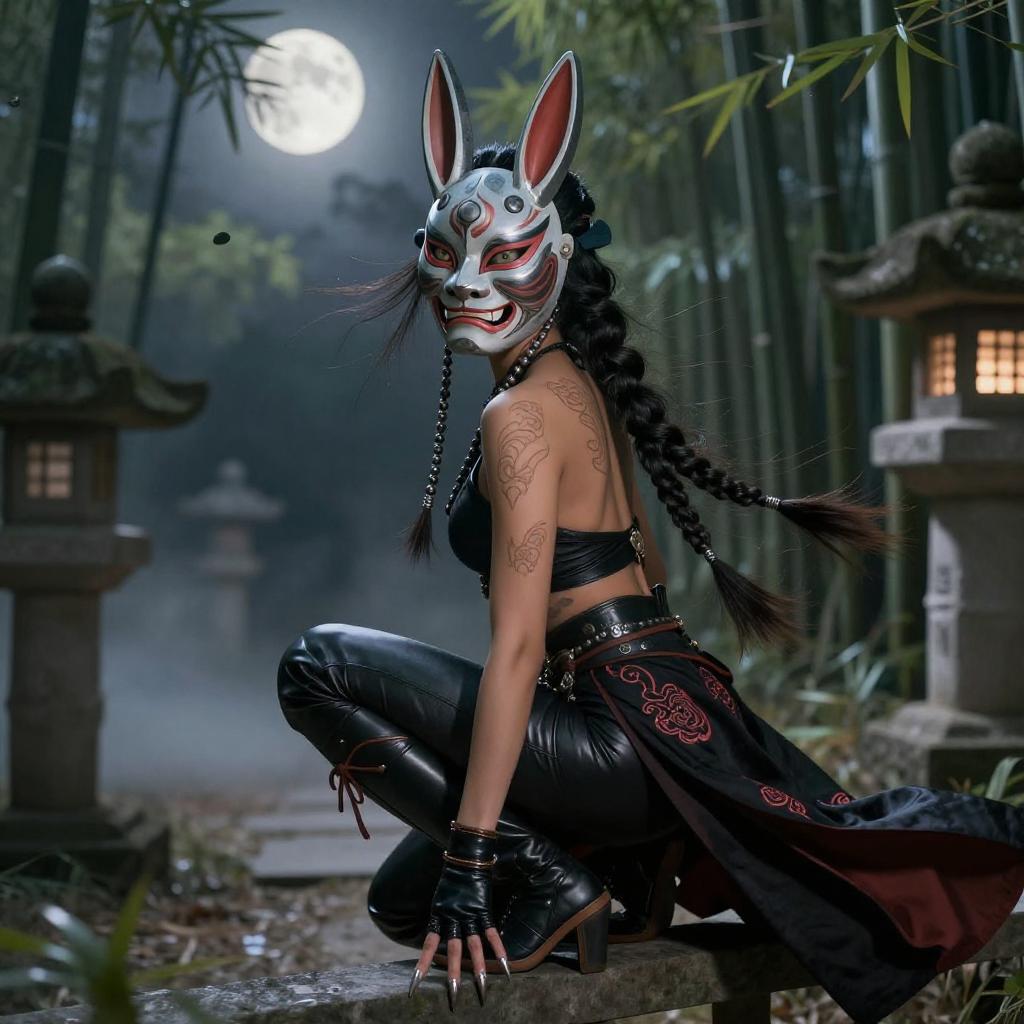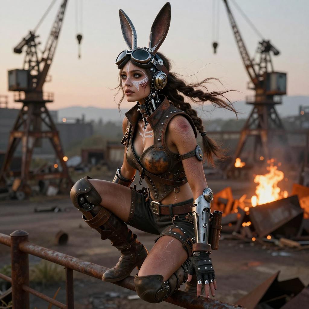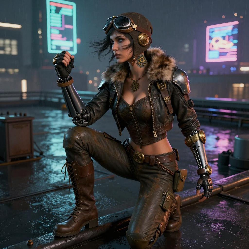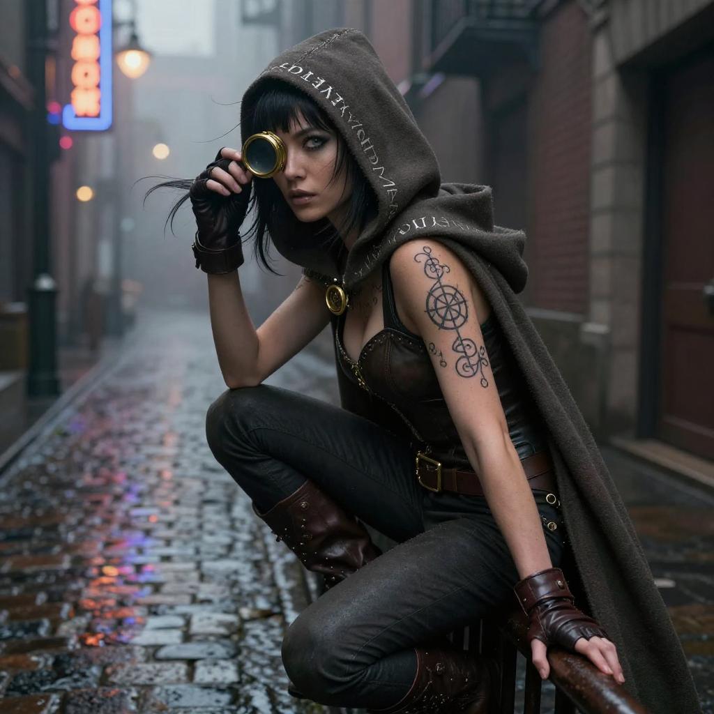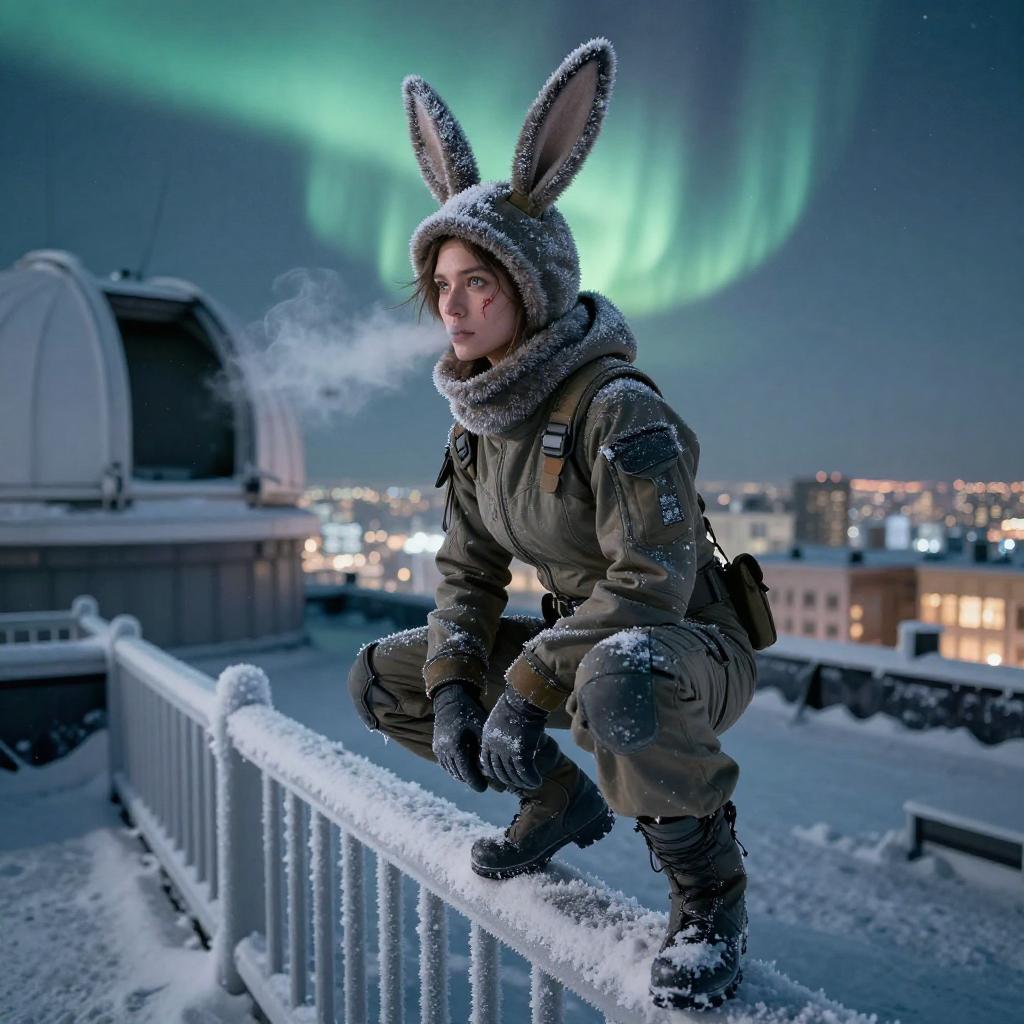 Ultra-detailed, 8k, masterpiece, 1 woman (solo:1.3), textured skin, beautiful detailed face, luminous detailed eyes, detailed pupils, dynamic pose, dynamic angle, squatting on railing, full body, cowboy shot, from above, from behind, (looking away:1.3), ambient light, realistic shadows, rim light, depth of field, bokeh, sharp focus, wind-swept accents, cinematic composition, athletic cyberpunk archer with fox-shaped cybernetic ears, short cropped hair, lithe muscular build, faint cheek scar, quiver of high-tech arrows on her back, armored leather corset, asymmetrical long coat with glowing blue trim, thigh-high armored boots, fingerless tactical gloves, utility belt with electromagnetic arrow launcher, rain-slick neon rooftop at dusk, holographic billboards and drifting fog, puddles reflecting neon signs, distant monorail lines and towering spires on the skyline